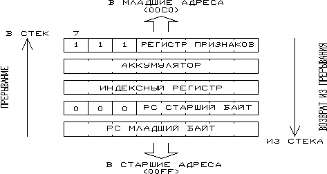 Рис. 2-3 Порядок загрузки регистров в стек и выгрузки их из стека. На рисунке 2-4 показан процесс обработки прерывания, а в таблице 2-2 даны векторы всех прерываний. В первом столбце таблицы указан регистр статуса, в котором находится соответствующий флаг прерывания, во втором столбце даны названия флагов прерываний. В третьем столбце кратко описана причина возникновения прерывания, в четвертом столбце указано устройство-источник прерывания, и в пятом столбце приведен адрес по которому хранится вектор прерывания. Важно отметить, что бит маски прерываний (бит I в регистре признаков) будет сброшен только в том случае, если соответствующий бит в стеке хранит 0. Рассмотрим подробнее каждый тип прерывания. Программное прерывание является результатом выполнения команды SWI (SoftWare Interrupt). Оно возникает вне зависимости от состояния бита I. Вектор прерывания содержится в ячейках памяти с адресами 1FFCH и 1FFDH. Внешнее прерывание происходит если бит маски прерываний (бит I) сброшен и на внешний вывод IRQ/ поступает сигнал активного уровня (режим срабатывания задается записью в бит IRQ регистра конфигурации, см. п. 1.3). Затем текущее состояние процессора запоминается в стеке, и бит I устанавливается в 1 для маскирования всех прерываний до тех пор, пока обслуживается внешнее. Прерывание от таймера может быть вызвано тремя флагами, как уже упоминалось ранее. Эти три флага расположены в регистре статуса таймера, и имеют один и тот же вектор (см. таблицу 2-2). Каждый флаг имеет соответствующий управляющий бит (ICIE, OCIE и TOIE) в регистре управления таймером. Установка этих битов разрешает соответствующее прерывание, сброс-запрещает. Подробнее назначение каждого флага описано в главе 2.3 "Таймер".