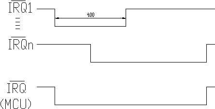 Рис. 2-4 Процесс обработки прерывания Прерывание от последовательного интерфейса связи происходит в том случае, если один из пяти флагов (TDRE, TC, RDRF, IDLE, OR) в регистре статуса интерфейса связи установлен, бит I в регистре признаков сброшен и управляющий бит во втором управляющем регистре установлен. При обслуживании прерывания приоритет обработки задается программно через проверку флагов в регистре статуса. Подробнее о регистрах интерфейса связи рассказывается в главе 2.4 "Последовательный интерфейс". Прерывание от последовательного периферийного интерфейса происходит при тех же условиях (установлен один из двух флагов в регистре статуса периферийного интерфейса (SPIF или MODF), бит I сброшен, и управляющий бит в управляющем регистре установлен). Подробнее о периферийном интерфейсе рассказывается в главе 2.4 "Последовательный интерфейс". Функциональная схема обработки внешних прерываний приведена на рис. 2-5. Внешнее прерывание может определяться либо фронтом сигнала, либо его фронтом и уровнем. Задается это программно через регистр конфигурации (см. гл. 1.3). Если прерывание определяется фронтом сигнала, то следующее прерывание не должно возникать до тех пор, пока не будет обработано первое, т. е. пока не будет выполнена команда возврата из прерывания (RTI). Время между двумя прерываниями должно быть минимум на 21 машинный цикл больше, чем время обработки прерывания (не включая команду RTI). При определении прерывания по уровню сигнала, следующее прерывание будет определяться в том случае, если после обработки первого прерывания на выводе IRQ/ будет сохраняться сигнал низкого уровня. Этот метод обычно используется при работе с несколькими источниками прерываний, объединенными в одну линию. Оба режима реакции на внешнее прерывание наглядно демонстрируются на рис. 2-6 и 2-7, соответственно. Таблица 2-2. Векторы прерываний.