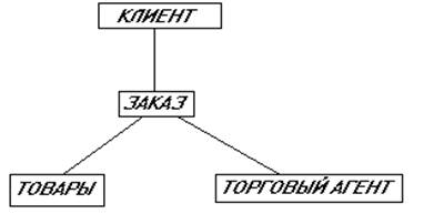 Где КЛИЕНТ, ЗАКАЗ, ТОРГОВЫЙ АГЕНТ являются записями (КЛИЕНТ - корневая запись), НОМЕР, ФАМИЛИЯ, ИМЯ, ОТЧЕСТВО - поля записи КЛИЕНТ, линиями показаны связи. Дерево - ориентированный граф(граф - пара множеств, одно из которых описывает множество вершин, а другое множество связей между ними) где все вершины, кроме корня, находятся в голове только одной дуги, корень не находится в голове ни одной из дуг и связан с вершиной дерева. Между записями в иерархии могут быть определены связи: “один ко многим”, или “один к одному”, где запись соответствующая элементу “один” указанной связи, определяется как исходная, а соответствующая элементу “много” - как порожденная. Сетевая модель подобна иерархической, но является более общей моделью, в том смысле, что между записями присутствуют связи “много ко многим” и “много к одному”, а так же здесь нет корневого узла, т.е. любая запись может быть корневой. Сетевая модель: