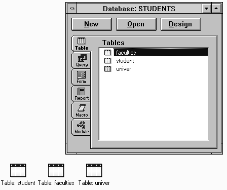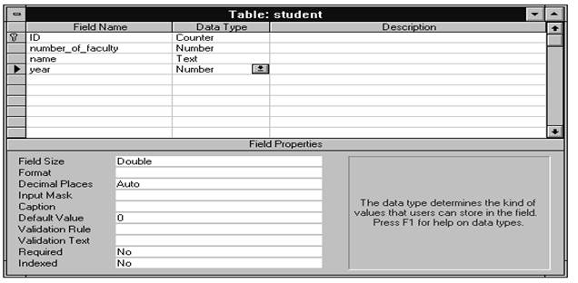 Где стрелочками показаны связи или отношения(реляции) между таблицами (т.к. Access реляционная СУБД). Итак, начнем. Запускаем Access и открываем Базу данных, назовем ее Students. Сначала нам надо построить три, выше описанных таблицы. Для этого нажимаем кнопку New и начнем конструировать первую таблицу. Вводим имена поле и их типы, первой записью вы можете ввести счетчик(тип counter) записей и установить первичный ключ, но это необязательно. Access при сохранении таблицы спросит: "Создать первичный ключ?" если Вы выберите Да, то он создаст новое поле с именем ID и типом counter. Дальше нам будут нужны только поля с типами Text и Number. Эти таблицы будут выглядеть так: 1.