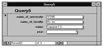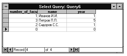 2. Дальше нам, например, может понадобиться выбрать из списка студентов всех обучающихся на первом курсе. Для этого существуют критерии выборки. Для того чтобы осуществить нужную нам выборку нам надо в QBE-запросе в поле Criteria столбца year поставить цифру ‘1’(это значит что из таблицы Student будут выбраны все записи у которых в поле столбца year стоит ‘1’). И если мы просмотрим Dynaset то увидим следующую таблицу: