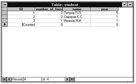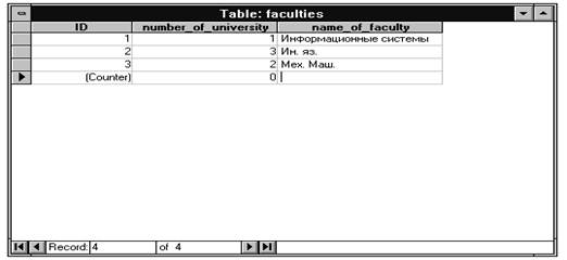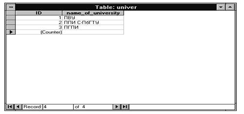 Эти связи нам нужны для облегчения поиска и выборки информации. Например при просмотре списка университетов Access автоматически устанавливает указатель(т.е. делает запись текущей) на первую запись в таблице Faculties содержащую в поле Namber_of_univer такое же число, что и в текущем поле ID таблицы Univer. Теперь мы можем заполнить какой-либо информацией эти три таблицы. Для этого в окне Базы Данных нажмите кнопку Open или в меню View выберите опцию Datasheet. И начинайте заполнять, поля с типом Cоunter заполняются автоматически. После заполнения, содержимое этих таблиц может выглядеть, например, так: 1.