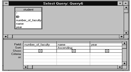 Как вы понимаете это минимальный набор информации по этой теме, но нам и его хватит. И так на данном этапе мы имеем Базу данных состоящую из трех связанных таблиц и содержащую некоторую информацию. Дальше нам надо как-то работать с этой Базой и в первую очередь нам надо производить поиск и выборку информации. Для этого существуют запросы. Построим несколько запросов. 1. Отсортируем таблицу student в алфавитном порядке по полю name. Для этого сделаем QBE-запрос такого вида: