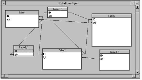 Дальше нам нужно установить связи между таблицами, для этого в меню Edit выберите опцию Relationships и установите связи между полями. Для установления связи выберите нужное вам поле, укажите на него мышкой и удерживая правую кнопку мыши покажите на поле с которым Вы хотите установить связь. Но здесь есть небольшое ограничение: поля между которыми Вы хотите установить связь должны быть одного типа. После установления связей наши таблицы будут выглядеть так (в данном случае мы установили связь один ко многим):