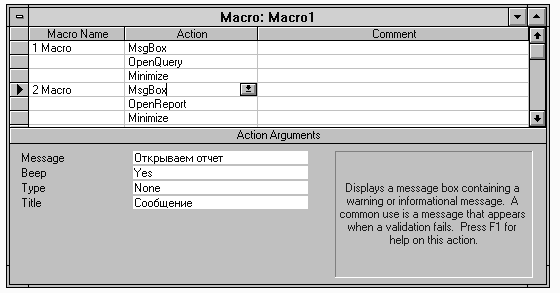 В окне проектирования макрокоманд каждая строка может содержать одну инструкцию в колонке Action и комментарий к ней в колонке Comment. Нужную инструкцию вы можете выбрать из предоставляемого списка. Колонка Condition содержит условные выражения для управления процессом выполнения макрокоманды. Эта колонка не обязательна и при первоначальной загрузке окна проектирования макрокоманд она не высвечивается. Выбрать ее Вы можете в меню View выбрав опцию Conditions. Вы так же можете создать макрогруппу содержащую несколько макрокоманд. Каждая из макрокоманд будет выполнятся независимо от других макрокоманд в группе. Макрокоманды в ходящие в макрогруппу представляют собой именованные последовательности инструкций. Создать макрогруппу Вы можете так: сначала создайте макрокоманду, а затем в колонке Macro Name в первой строке задайте ей имя. Эта колонка так же не обязательна и при первоначальной загрузке окна проектирования макрокоманд она не высвечивается. Выбрать ее Вы можете в меню View выбрав опцию Macro Names. В одном окне проектирования макрокоманд может содержаться несколько макрогрупп.