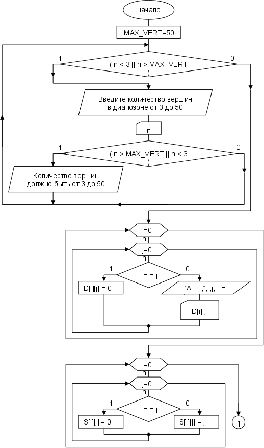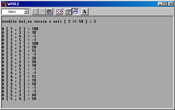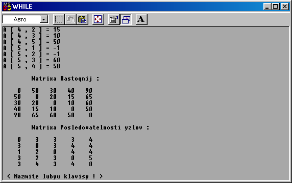 Листинг программы#include #include #define MAX_VERT 50 int main ( void ) { clrscr ( ); int k = 0, i = 0, j = 0, n = 0; int D [ MAX_VERT ][ MAX_VERT ]; int S [ MAX_VERT ][ MAX_VERT ]; /*-------->8-------------start>>Vvod*dannix----------------->8--------------*/ while ( n < 3 || n > MAX_VERT ) ; printf ( "\n" ); for ( i=0;i for ( j=0;j if ( i = = j ) D[i][j] = 0; else { printf ( "A [ %i , %i ] = ", i+1, j+1 ); scanf ( "%i", &D[i][j] ); }; }; }; for ( i=0;i for ( j=0;j if ( i==j ) S[i][j] = 0; else S[i][j] = j+1; }; }; /*-------->8---------------end>>Vvod*dannix----------------->8--------------*/ /*--------------------------------------------------------------------------------------*/ /*-------->8-------------start>>resenia*dannix-------------->8---------------*/ for( k=0;k for( i=0;i if ( k==i ) continue; for ( j=0;j if ( k = = j || i = = j ) continue; if ( ( ( D[i][j] > ( D[i][k] + D[k][j] ) ) || D[i][j] < 0 ) && D[k][j] > 0 && D[i][k] > 0 ){ D[i][j] = ( D[k][j] + D[i][k] ); S[i][j] = k+1; }; }; }; }; /*-------->8---------------end>>resenia*dannix-------------->8--------------*/ /*--------------------------------------------------------------------------------------*/ /*-------->8-------------start>>vivoda*dannix--------------->8---------------*/ printf ( "\n\t" ); printf ( "Matrixa Rastoqnij :" ); printf ( "\n\n" ); for ( i=0;i for ( j=0;j printf ( "%5i", D[i][j] ); }; printf ( "\n" ); }; printf ( "\n\t" ); printf ( "Matrixa Posledovatelnosti yzlov :" ); printf ( "\n\n" ); for ( i=0;i for ( j=0;j printf ( "%5i", S[i][j] ); }; printf ( "\n" ); }; /*-------->8---------------end>>vivoda*dannix--------------->8--------------*/ printf ( "\n < Nazmite lubyu klavisy ! >" ); getch ( ); return 0; };