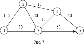 3. Численное решение показательного примера Найдем для сети, показанной на рисунке 5, кратчайшие пути между любыми двумя узлами. Расстояния между узлами этой сети проставлены на рисунке возле соответствующих ребер. Ребро (3,5) ориентировано, поэтому не допускается движение от узла 5 к узлу 3. Все остальные ребра допускают движение в обе стороны.