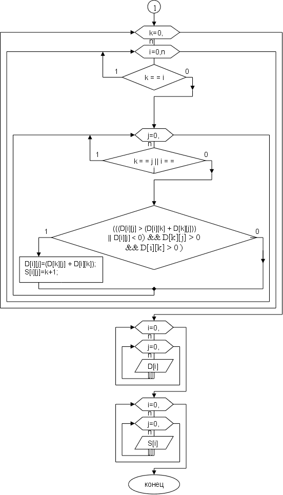 Определяем k-ую стоку и k-ый столбец как ведущую строку и ведущий столбец. а) осуществляется переборка всех элементов, если dik+dkjij, то элемент dij заменяется на сумму dij+dkj. При условии, что i≠k, j≠k и j≠i. б) cоставляется матрица расстояний D1 в соответствии с заменами на шаге 1 и матрица последовательности узлов, в котором элементы sij соответствующие элементам dij заменяется на k.