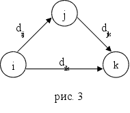2. Математическая формулировка задачи, обоснование Алгоритм ФлойдаАлгоритм Флойда находит кратчайший путь между любыми двумя узлами сети. В этом алгоритме сеть представлена в виде квадратной матрицы с n строками и n столбцами. Элемент (i ,j) равен расстоянию dij от узла i к узлу j, которое имеет конечное значение, если существует дуга (i ,j), и равен бесконечности в противном случае. Покажем сначала основную идею метода Флойда. Пусть есть три узла i, j и k и заданы расстояния между ними (рис. 3). Если выполняется неравенство dij + djk < dik, то целесообразно заменить путь i → k путем i → j → k. Такая замена (далее ее будем условно называть треугольным оператором) выполняется систематически в процессе выполнения алгоритма Флойда.