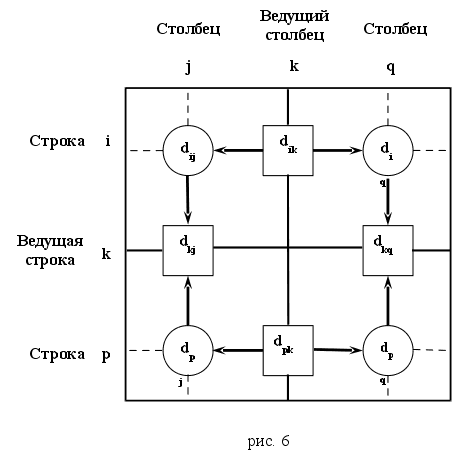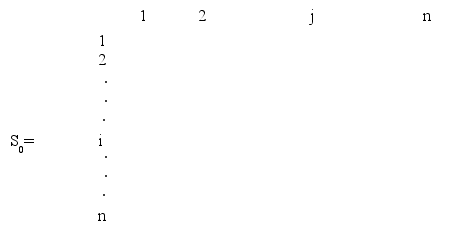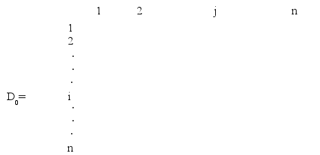 Алгоритм Флойда требует выполнения следующих действий. Шаг 0. Определяем начальную матрицу расстояний D0 и матрицу последовательности узлов S0. Диагональные элементы обеих матриц помечаются знаком “ – “, показывающим, что эти элементы в вычислениях не участвуют. Полагаем k=1. Основной шаг. Задаем строку k и столбец k как ведущую строку и ведущий столбец. Рассматриваем возможность применения треугольного оператора ко всем элементам dij матрицы Dk-1. Если выполняется неравенство dij + djk < dik (i ≠k, j≠k, i ≠j), тогда выполняем следующие действия :