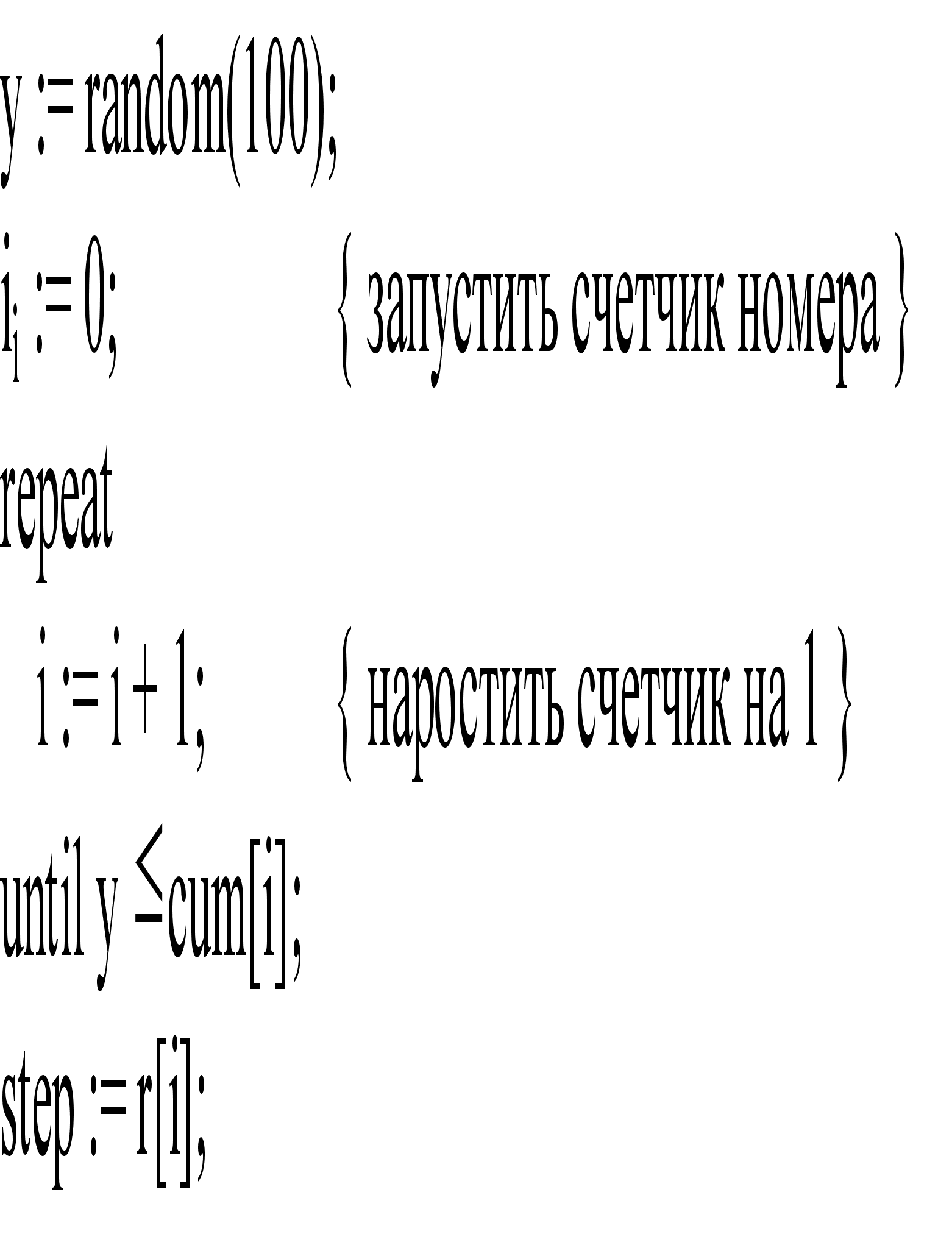 В программе полученное равномерно распределенное число y последовательно начиная с 1-го сравнивается с числами четвертого столбца. При этом номер числа последовательно наращивается. Как только y превысит очевидное число из 4-го столбца, процедура заканчивает свою работу. Номер последнего числа считается номером избранного числа, значение которого извлекается из первого столбца.