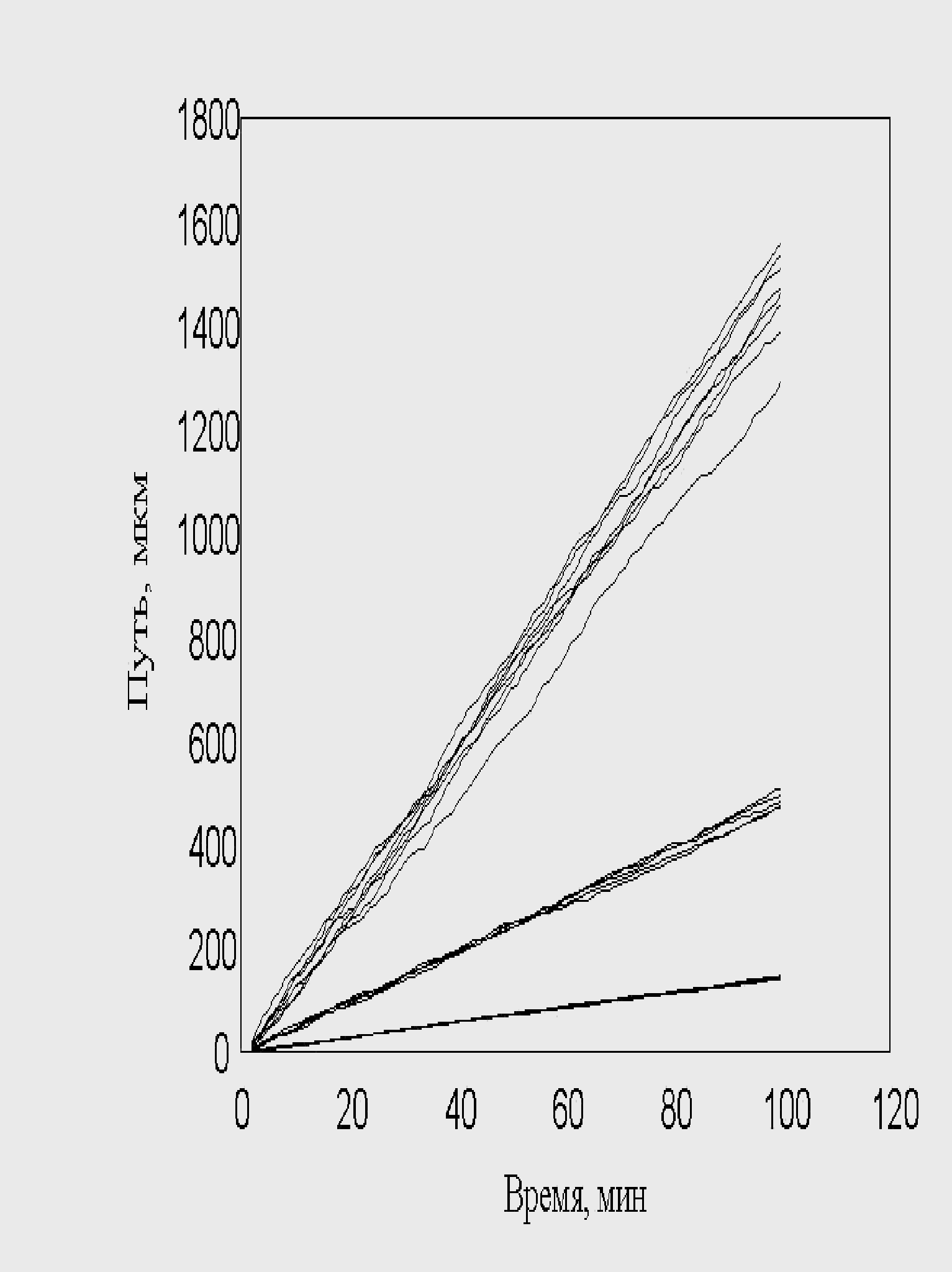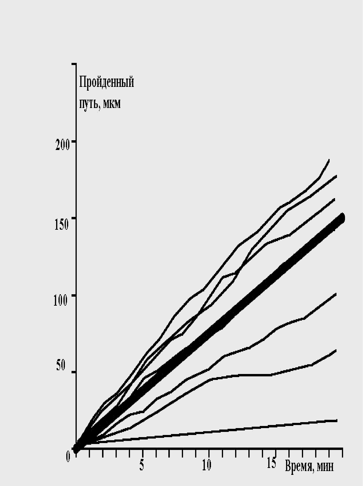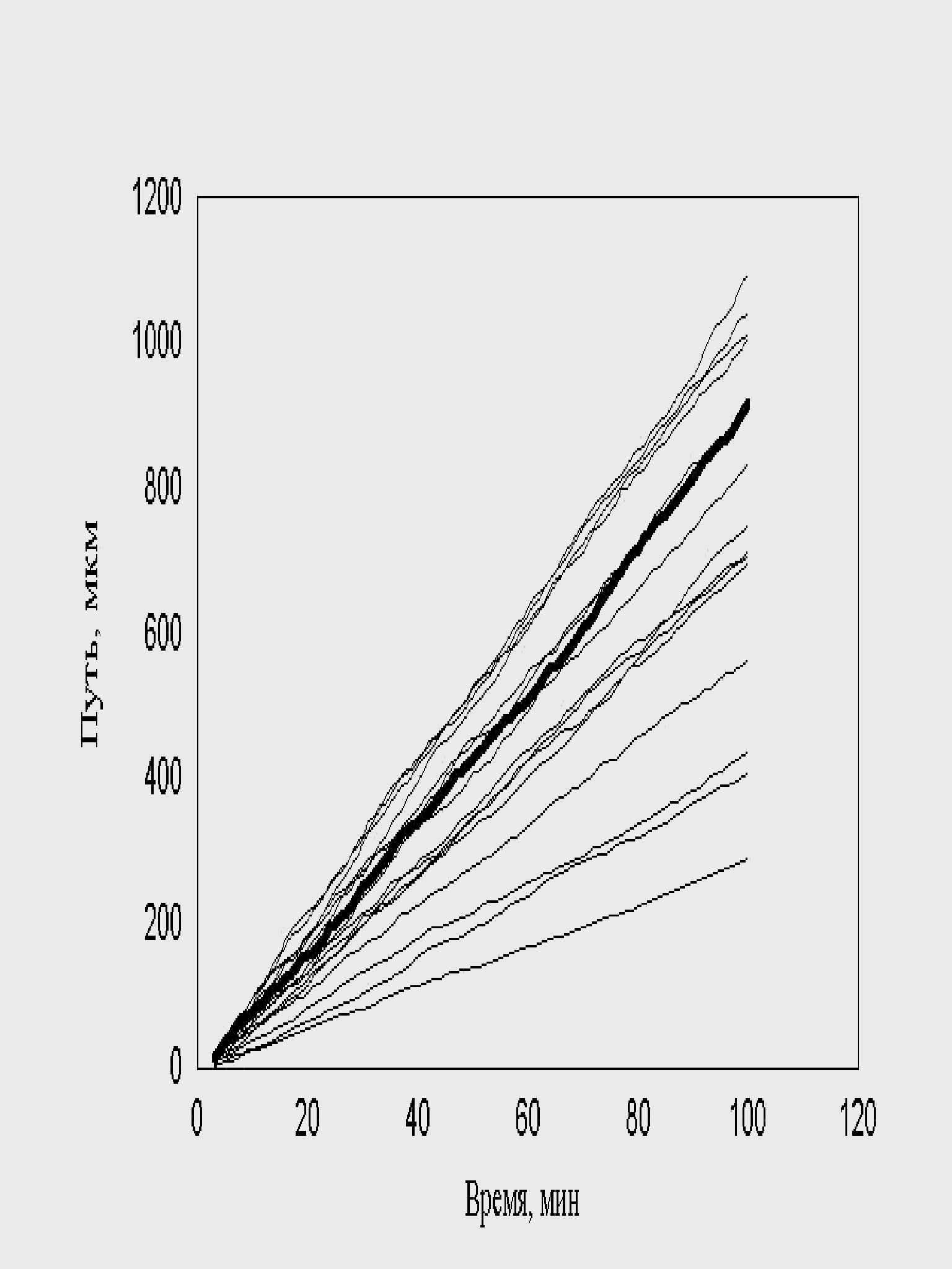 рис. 15 Зависимость пройденного пути от времени. Три группы клеток (max_step: 3, 10, 30 mcm, соотношение 1:1:1 время измерения каждый десятый шаг) Однако «теоретический наблюдатель» имел возможность регистрировать положение клеток только на каждом 10-м шаге. В этом случае существование трех групп клеток практически не видно. Это связано с тем, что траектория движения клеток запутанная. Часто встречаются случае, когда клетки за 10 шагов успевают повернуть на зад. Таким образом, на каких-то участках траектории «возникает иллюзия» малых шагов у быстрых клеток и возникает картина, похожая на экспериментальную. Интересно отметить, что максимальная скорость измерения упала в 3 раза (приблизительно 10) по сравнению с заданной в программе. Последний расчет указывает на то, что выбор интервала времени, для последовательного положения клеток, очень существенен. В экспериментах положение клетки оценивалось как положение её центра масс. Ясно, что координаты меняются от изменения формы клеток. Из этого следует, что чем меньше интервал времени, между измерениями, тем точнее измерение скорости. Однако смещение центра масс на расстояние меньше размера клеток нельзя считать устойчивым. В результате, для измерения скорости был выбран интервал 1 минута, который примерно соответствует смещению средних клеток на расстояние порядка их размера. Последний рисунок не смотря с его схожестью с экспериментом не может считаться истинным. Таким образом приходим к выводу, что деление сделанное экспериментатором на быстрые, средние и медленные клетки очень условно и его можно принимать только как некую мнемонику. Таким образом, было введено принципиальное изменение в модели рис. 16. В популяции присутствовали клетки с непрерывно распределенными скоростями, а не три ярко выраженные группы. Распределение минутных сдвигов для каждой клетки было принципиально таким же, как и в предыдущей модели. Сдвиги распределены от 0 до rmax, а величины rmax в популяции были распределены в соответствии с таким же распределением. Генерировалась случайная популяция клеток, после чего для каждой клетки генерировались сдвиги, и рассчитывалось движение клеток в популяции. Результат расчета, показанный на рис. 16, полностью совпадает с экспериментальным. Мы моделировали не только перемещение, но и процесс измерения перемещений. Процедура измерений перемещений просматривала все движущиеся клетки, не зная к какой группе относится каждая из них.