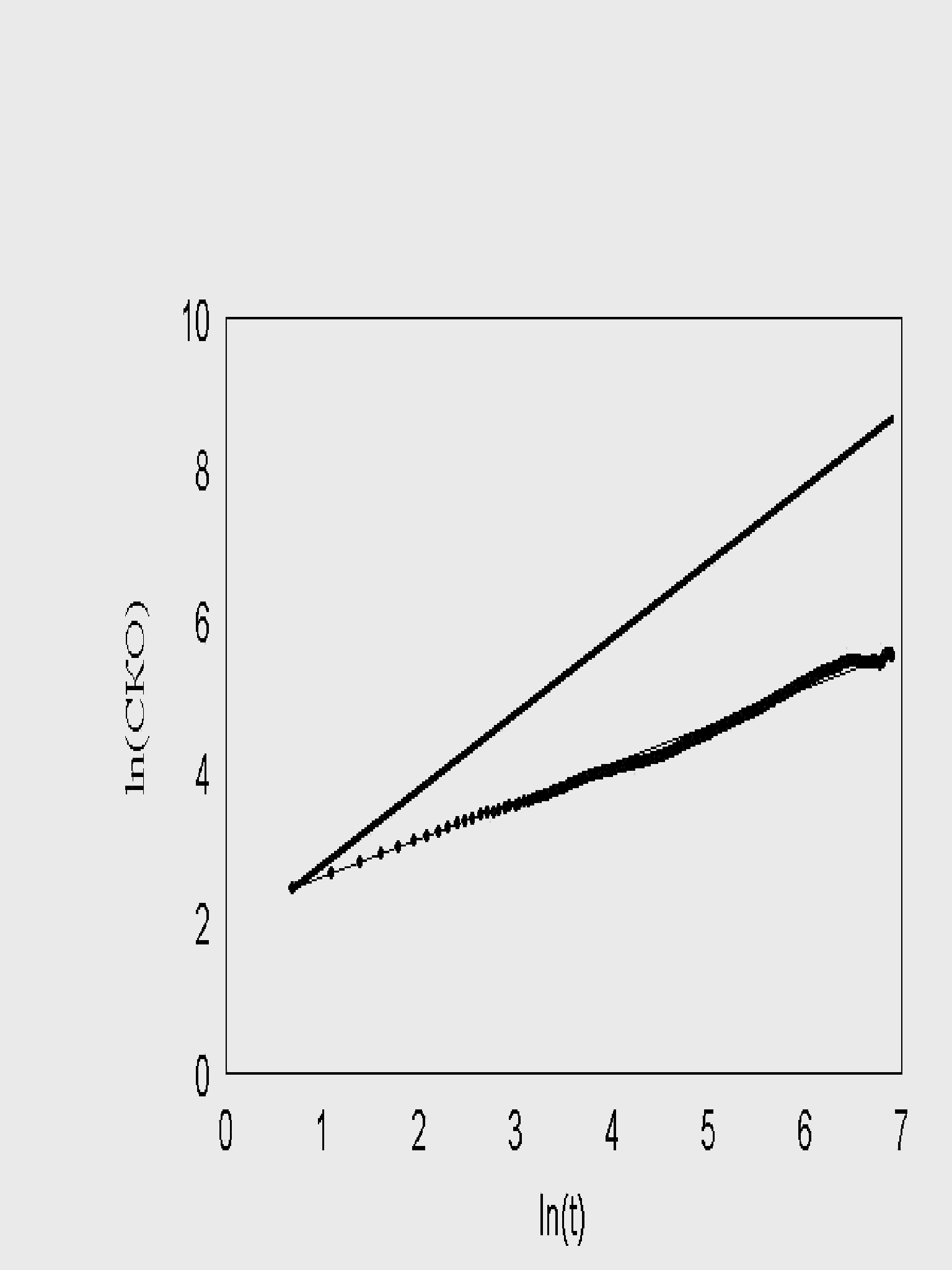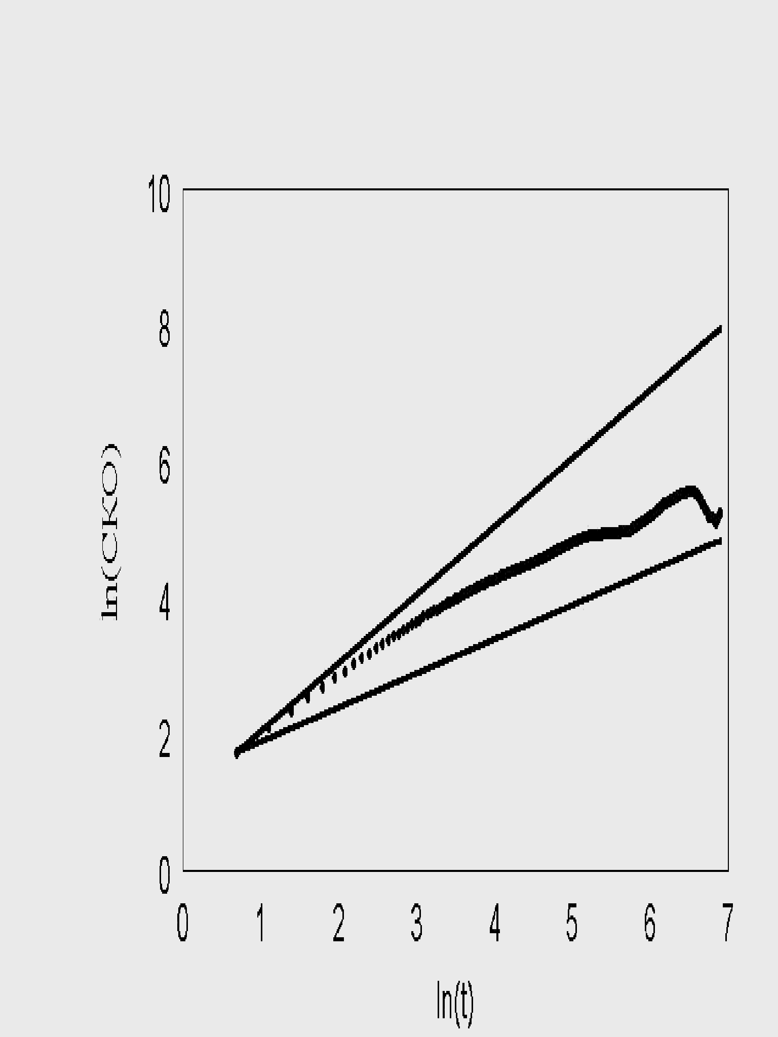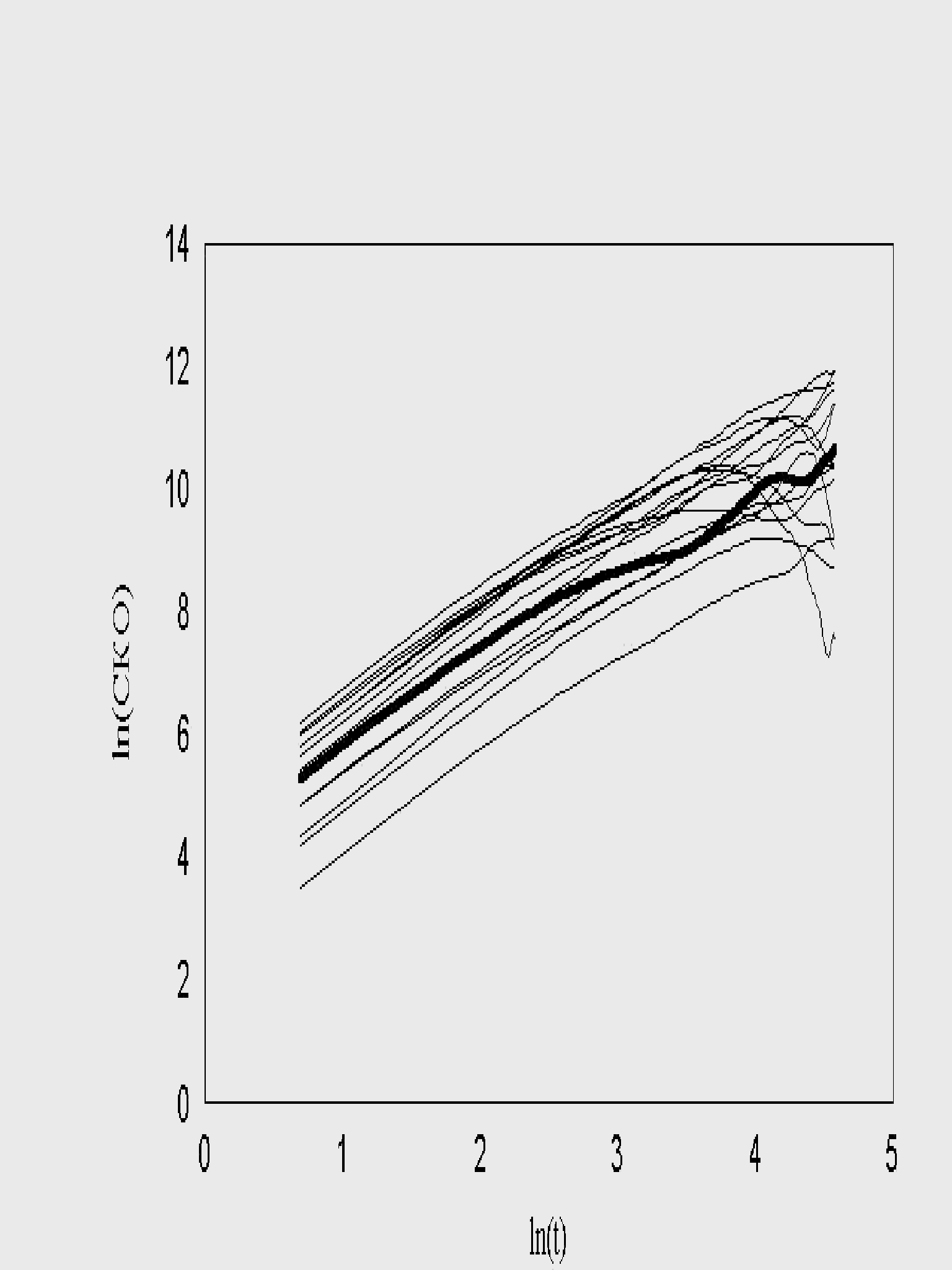 рис. 15 Зависимость пройденного пути от времени. Три группы клеток (max_step: 3, 10, 30 mcm, соотношение 1:1:1 время измерения каждый десятый шаг) Однако «теоретический наблюдатель» имел возможность регистрировать положение клеток только на каждом 10-м шаге. В этом случае существование трех групп клеток практически не видно. Это связано с тем, что траектория движения клеток запутанная. Часто встречаются случае, когда клетки за 10 шагов успевают повернуть на зад. Таким образом, на каких-то участках траектории «возникает иллюзия» малых шагов у быстрых клеток и возникает картина, похожая на экспериментальную. Интересно отметить, что максимальная скорость измерения упала в 3 раза (приблизительно 10) по сравнению с заданной в программе. Последний расчет указывает на то, что выбор интервала времени, для последовательного положения клеток, очень существенен. В экспериментах положение клетки оценивалось как положение её центра масс. Ясно, что координаты меняются от изменения формы клеток. Из этого следует, что чем меньше интервал времени, между измерениями, тем точнее измерение скорости. Однако смещение центра масс на расстояние меньше размера клеток нельзя считать устойчивым. В результате, для измерения скорости был выбран интервал 1 минута, который примерно соответствует смещению средних клеток на расстояние порядка их размера. Последний рисунок не смотря с его схожестью с экспериментом не может считаться истинным. Таким образом приходим к выводу, что деление сделанное экспериментатором на быстрые, средние и медленные клетки очень условно и его можно принимать только как некую мнемонику. Таким образом, было введено принципиальное изменение в модели рис. 16. В популяции присутствовали клетки с непрерывно распределенными скоростями, а не три ярко выраженные группы. Распределение минутных сдвигов для каждой клетки было принципиально таким же, как и в предыдущей модели. Сдвиги распределены от 0 до rmax, а величины rmax в популяции были распределены в соответствии с таким же распределением. Генерировалась случайная популяция клеток, после чего для каждой клетки генерировались сдвиги, и рассчитывалось движение клеток в популяции. Результат расчета, показанный на рис. 16, полностью совпадает с экспериментальным. Мы моделировали не только перемещение, но и процесс измерения перемещений. Процедура измерений перемещений просматривала все движущиеся клетки, не зная к какой группе относится каждая из них.