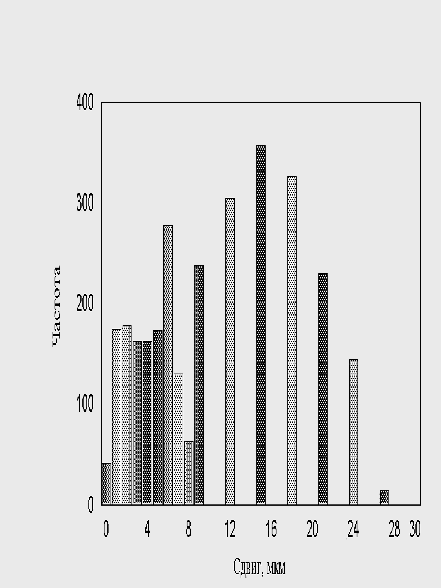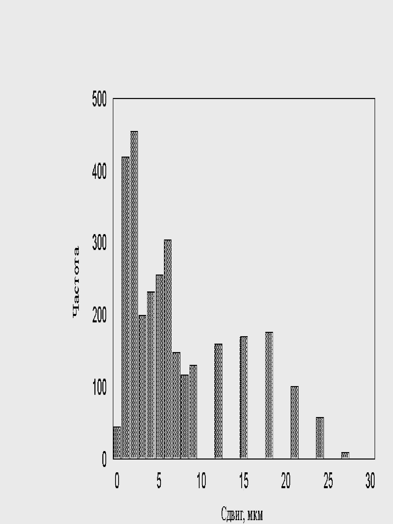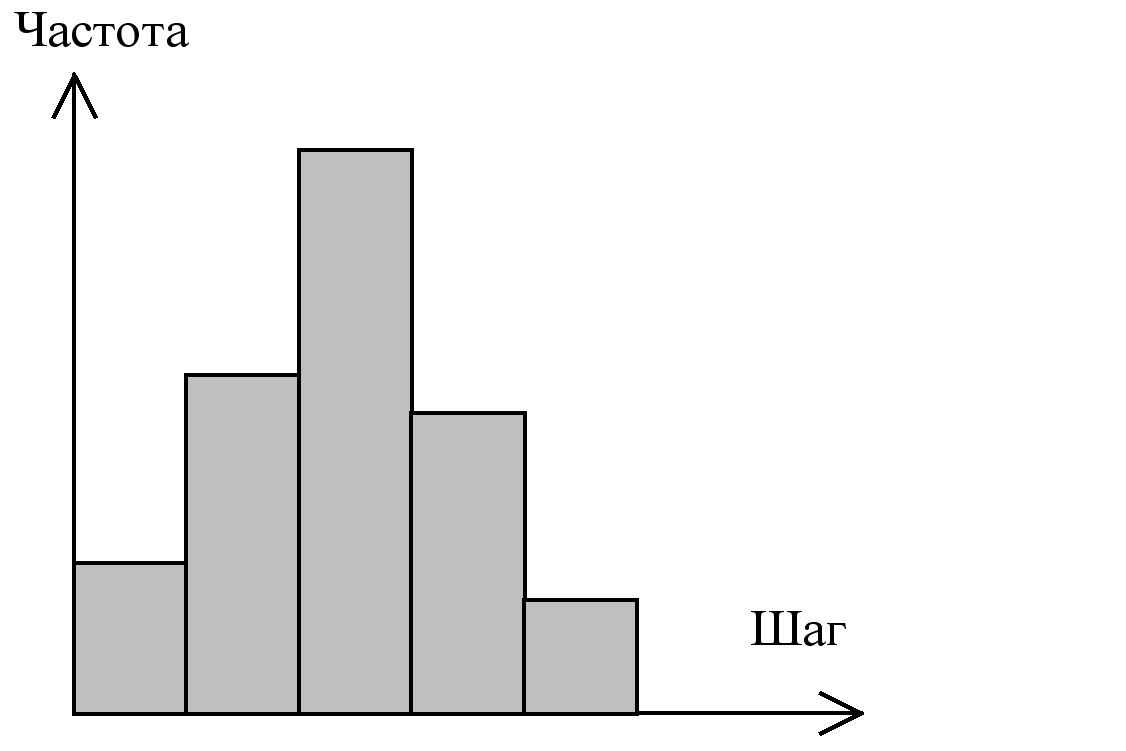 Результаты исследованияПри исследовании движения популяции клеток было обнаружено, что нейтрофилы, выделенные из одной и той же пробы, движутся с различными скоростями. Этот факт может объясняться многими причинами, главные из которых, по видимому, является возраст клеток, но мы не будем подробно изучать зависимость клеток от возраста. Экспериментатор, условно разделил клетки на медленные, средние и быстрые. Количество таких клеток в популяции составляет 15 : 30 : 55. При моделировании популяции мы исходим из этого соотношения. Программа генерировала случайное количество быстрых, средних и медленных «клеток», в среднем дающих экспериментальное соотношение. При моделировании клеток в популяции, экспериментальный шаг (шаг за единицу времени) случаен. Распределение этих шагов, задается распределением, показанным на рис. 11.