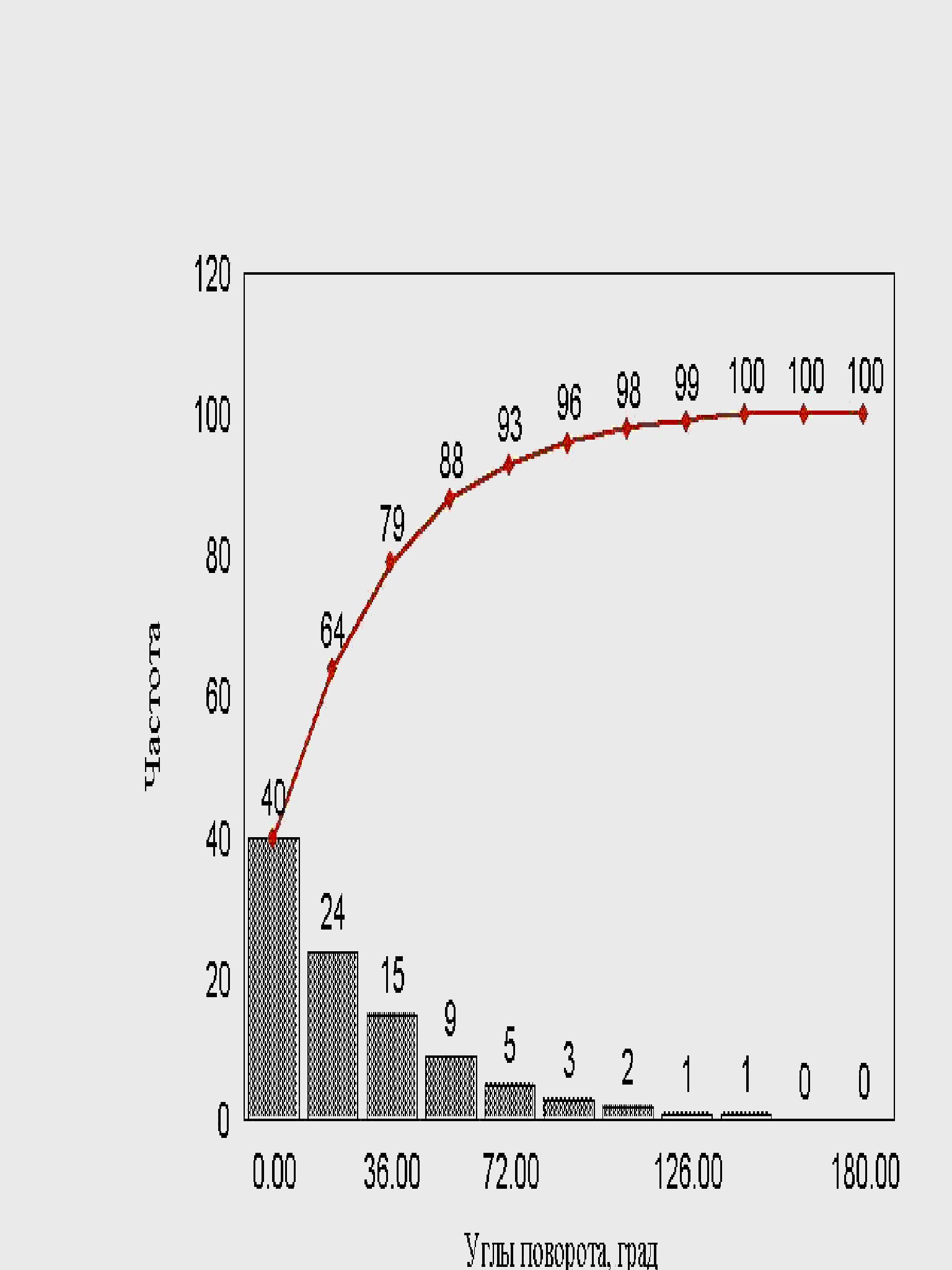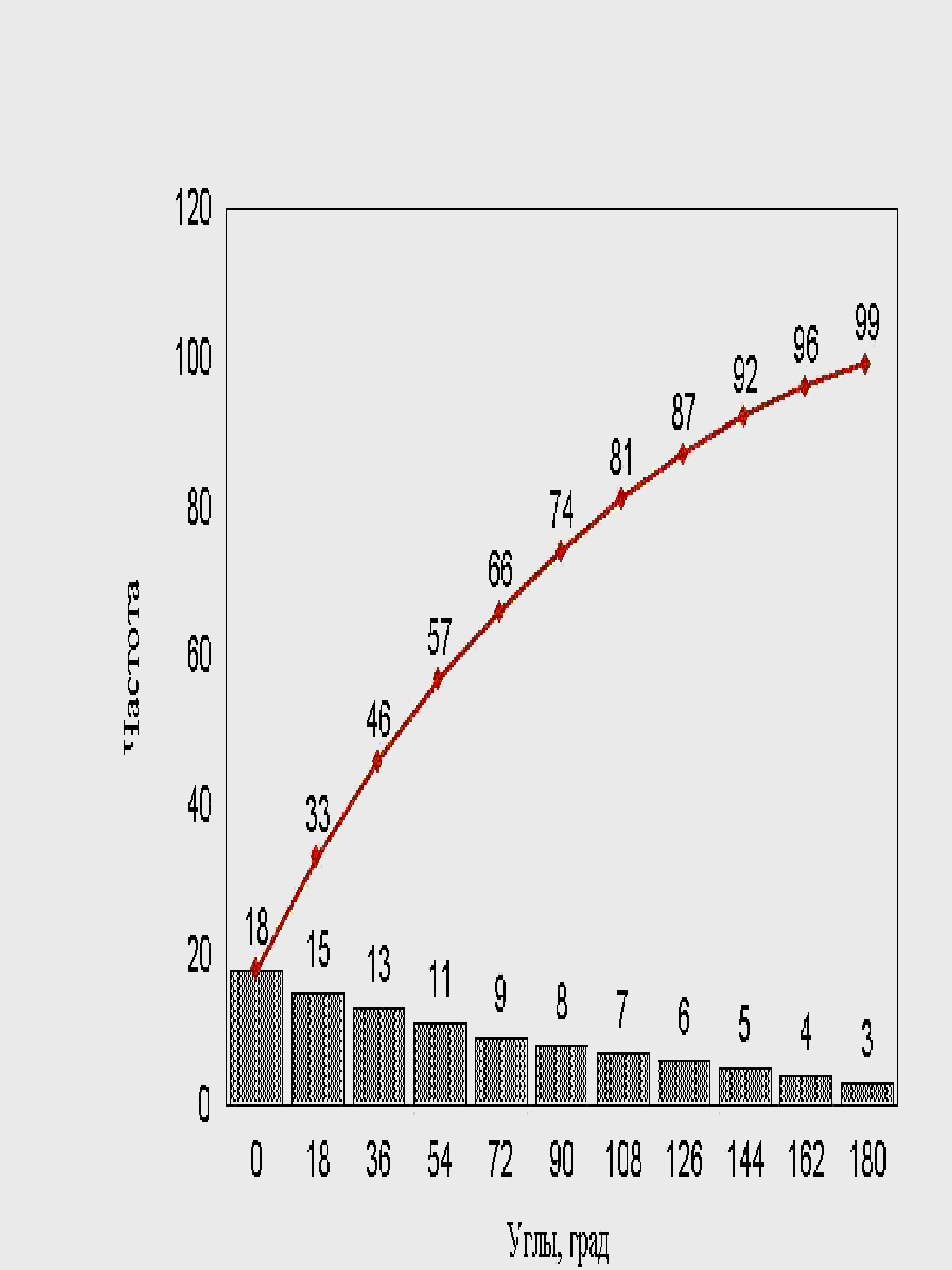 рис. 3 Распределение (частота встречаемости) шагов, на которые клетка перемещается за выбранный промежуток времени (1 минута). Клетка во время движения может менять как шаги, так и углы поворотов, от 0 до 1800. Углы меняются по отношению к предыдущему направлению клетки. Случайные углы поворота нейтрофилов характеризуются распределением: