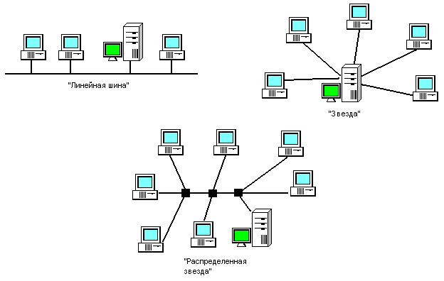 4) Сетевая операционная система. Это программа, которая устанавливается на файл-сервере и служит для обеспечения интерфейса между пользователями и данными на сервере. 5) Файл-сервер. Он служит для хранения и размещения программ и файлов данных, которые используются для коллективного доступа пользователей. 6) Сетевая печать. Она позволяет многим пользователям локальной сети совместно использовать одно или несколько печатающих устройств. 7) Защита локальной сети. Защита сети представляет собой набор методов, применяемых для защиты данных от повреждений со стороны несанкционированного доступа или какой-либо случайности. 8) Мосты, шлюзы и маршрутизаторы. Они позволяют соединять сети между собой. 9) Управление локальной сетью. Это все, что относится к перечисленным ранее задачам администратора. На рисунке приведено несколько топологий локальных сетей: