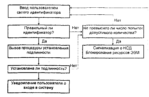 Сам идентификатор может представлять собой последовательность любых символов и должен быть заранее зарегистрирован в системе администратором службы безопасности. В процессе регистрации администратором в базу эталонных данных системы защиты для каждого пользователя заносятся следующие элементы данных[2]: - фамилия, имя, отчество и, при необходимости, другие характеристики пользователя; - уникальный идентификатор пользователя; - имя процедуры установления подлинности; - используемая для подтверждения подлинности эталонная информация, например, пароль; -ограничения на используемую эталонную информацию, например, минимальное и максимальное время, в течение которого указанный пароль будет считаться действительным; -полномочия пользователя по доступу к компьютерным ресурсам. Процесс установления подлинности, называемый еще аутентификацией, заключается в проверке, является ли пользователь, пытающийся осуществить доступ в ВС, тем, за кого себя выдает[2]. Общая схема идентификации и установления подлинности пользователя при его доступе в компьютерную систему представлена на Рис. 1.1. Если в процессе аутентификации подлинность пользователя установлена, то система защиты должна определить его полномочия по использованию ресурсов ВС для последующего контроля установленных полномочий. Основными и наиболее часто применяемыми методами установления подлинности пользователей являются методы, основанные на использовании паролей. Под паролем при этом понимается некоторая последовательность символов, сохраняемая в секрете и предъявляемая при обращении к компьютерной системе. Ввод пароля, как правило, выполняют с клавиатуры после соответствующего запроса системы.