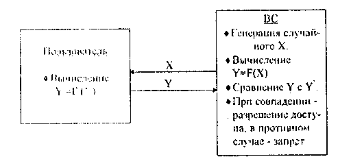 Рис. 1.2. Схема аутентификации по методу «рукопожатия» Например, в ВС генерируется и выдается пользователю случайное число, состоящее из семи цифр. Для заблуждения злоумышленника в любое место числа может вставляться десятичная точка. В качестве функции F принимается Y = ()2 - + . Для высокой безопасности функцию «рукопожатия» целесообразно циклически менять через определенные интервалы времени, например, устанавливать разные функции для четных и нечетных чисел месяца. Достоинством метода «рукопожатия» является то, что никакой конфиденциальной информации между пользователем и ВС не передается. По этой причине эффективность данного метода особенно велика при его применении а вычислительных сетях для подтверждения подлинности пользователей, пытающихся осуществить доступ к серверам или центральным ЭВМ. В некоторых случаях может оказаться необходимым пользователю проверить подлинность той ВС, к которой он хочет осуществить доступ. Необходимость во взаимной проверке может понадобиться и когда два пользователя ВС хотят связаться друг с другом по линии связи. Методы простых паролей, а также методы модификации схем простых паролей в этом случае не подходят. Наиболее подходящим здесь является метод «рукопожатия». При его использовании ни один из участников сеанса связи не будет получать никакой секретной информации. 2 ТИПОВЫЕ РЕШЕНИЯ В ОРГАНИЗАЦИИ КЛЮЧЕВЫХ СИСТЕМ Рассмотрим структуры данных и алгоритмы идентификации и аутентификации на основе ключевой информации, а также иерархию хранения ключей. Поскольку предполагается выполнение процедур как идентификации, так и аутентификации, допустим, что i-й аутентифицирующий объект (i-й ключевой носитель) содержит два информационных поля: IDi - неизменяемый идентификатор i-го пользователя который является аналогом имени и используется для идентификации пользователя, и К, - аутентифицирующая информация пользователя, которая может изменяться и служит для аутентификации[1]. На самом деле IDi может соответствовать разным пользователям, например носитель сенсорной памяти Touch Memory содержит 8 байт неизменяемого идентификатора носителя, но при этом ТМ может быть передан разным пользователям. Совокупную информацию в ключевом носителе будем называть первичной аутентифицирующей информацией i-ro пользователя. Описанная структура соответствует практически любому ключевому носителю, служащему для опознания пользователя. Например, ТМ имеет 8 байт, не перезаписываемого неповторяющегося серийного номера, который однозначно характеризует конкретное ТМ, и некоторый объем перезаписываемой памяти, соответствующий аутентифицирующей информации Kj. Аналогично для носителей типа пластиковых карт выделяется неизменяемая информация IDi первичной персонализации пользователя и объект в файловой структуре карты, содержащий Ki.