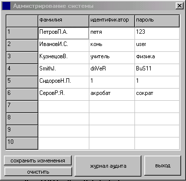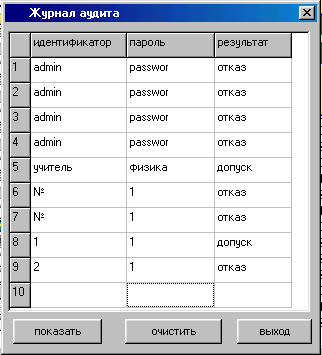 Алгоритм доступа 1. Пользователь i идентифицируется и аутентифицируется в компьютерной системе. При положительном исходе ключ пользователя Кj доступен субъектам (программам) системы, регулирующим доступ к объектам. 2. Пользователь производит доступ к зашифрованному объекту Yj. Выполняется поиск дополнительного объекта уj. В объекте уj проверяется наличие E(kj, Ki), т.е. ключа доступа к объекту, зашифрованного на ключе пользователя. Если E(kj, Кi) не найден, то доступ пользователя отвергается. Иначе выполняются следующие действия. 3. Производится расшифрование ключа kj = D(yj, Ki), а затем - расшифрование объекта Oj= D(Yj, ki). Под объектами доступа могут пониматься абоненты распределенной системы (сети связи). В этом случае ключ kj является ключом взаимодействия между пользователем i и абонентом j (это может быть также пользователь, терминал, принтер и т.д.). При рассмотрении сети связи обычно оперируют матрицей ключей, которая в явном виде отображает топологию связей в системе. 3. ПРОГРАММА 3.1.ОПИСАНИЕ ПРОГРАММЫ. 3.1.1 Используемая процедура опознавания. В программе заложена процедура опознавания с использованием простого пароля. Системой предусмотрено ограниченное количество повторений для ввода пароля. При третьем подряд неправильном вводе идентификационных или аутентификационных данных программа прекращает работу. В базе эталонных данных системы защиты пароли хранятся в зашифрованной форме. При этом используется шифрование методом гаммирования. В качестве ключа шифрования используется псевдослучайная последовательность битов, полученная с помощью линейного конгуэртного генератора[3]. Этот генератор вырабатывает последовательность псевдослучайных чисел Y1, Y2, …Yi-1, Yi,…, используя соотношение: Yi=(a*Yi-1+b)mod m, где Yi-iе (текущее) число последовательности; a-множитель (коэффициент); b-приращение; m-модуль; Y 0-порождающее число (исходное значение). Данное уравнение генерирует псевдослучайные числа с периодом повторения, который зависит от выбираемых значений параметров a,b,m и может достигать значения m. 3.1.2 Распределение ключей. Программа позволяет устанавливать до десяти различных идентификаторов пользователей и паролей к ним. Длины идентификатора и пароля совпадают и составляют по десять символов каждый. Что позволяет обеспечить достаточную степень защиты, так как при попытке проникнуть в программу, не зная пароля даже при известном идентификаторе используя метод простого перебора ключей, потребует около 18010 повторений ввода пароля. Это достигается тем, что при выборе ключей допускается использование любых символов обоих регистров клавиатуры за исключением клавиши ‘пробел’. Пароль администратора является постоянным и не может быть изменен никакими способами кроме внесения изменений в код программы с последующей перекомпиляцией исходных модулей. 3.1.3 Возможности администратора. Администратор может просматривать и изменять список пользователей программы, а также изменять их идентификаторы и пароли. Он также имеет возможность просматривать и периодически очищать автоматически ведущийся журнал аудита, в который заносится информация какие идентификаторы и пароли используются при попытках входа в программу и результат работы процедуры установления подлинности (разрешен / не разрешен вход). 3.2 АЛГОРИТМ ПРОГРАММЫ. Укрупненный алгоритм о