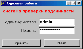 ЗАКЛЮЧЕНИЕ В курсовой работе были рассмотрены существующие процедуры опознавания и приведены типовые решения в организации ключевых систем. На основании рассмотренного материала можно сделать вывод о том, что: -пароли в системе должны храниться обязательно в зашифрованном виде; -рядовые пользователи не должны иметь доступ к эталонной информации; -должна быть найдена ‘золотая середина’ между легкостью запоминания пароля и его не тривиальностью. На основании рассмотренных процедур была создана программа, позволяющая разграничивать доступ к какому-либо отдельно взятому приложению, работающему в операционной среде Windows. В приложении В представлен листинг исходного модуля программы. Так как программа носит ознакомительный характер, то запуск приложения имитируется вызовом сообщения, говорящего о том, что процедура установления подлинности пройдена успешно. ПРИЛОЖЕНИЕ A (ИНТЕРФЕЙС ПРОГРАММЫ)
