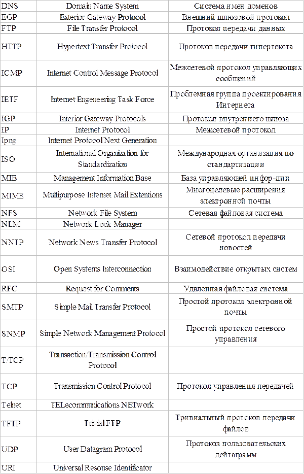Реферат: Обзор семейства протоколов TCP/IPРеферат: Обзор семейства протоколов TCP/IPСодержание Введение. 1 Эталонная модель OSI 2 Анатомия модели TCP/IP. 4 Прикладной уровень. 4 Межхостовой уровень. 4 Межсетевой уровень. 4 Уровень сетевого доступа. 5 Преимущества TCP/IP. 5 Уровни и протоколы TCP/IP. 6 Модель TCP/IP. 6 Семейство протоколов TCP/IP. 6 Протокол IP. 7 Задачи протокола IP. 8 Протокол ТСР. 8 Задачи протокола ТСР. 8 Протокол UDP. 8 Задачи протокола UDP. 9 Telnet 9 FTP. 10 TFTP. 11 SMTP. 11 NFS. 12 SNMP. 13 World Wide Web. 14 HTTP. 14 Заключение. 17 Приложение. 19 Список используемой литературы.. 20 ВведениеВ общем случае термин TCP/IP обозначает целое семейство протоколов: TCP (Transmission Control Protocol/Internet Protocol) для надежной доставки данных, UDP (User Datagram Protocol) для негарантированной доставки, IP (Internet Protocol) и других прикладных служб. TCP/IP является открытым коммуникационным протоколом. Открытость означает, что он обеспечивает связь в любых комбинациях устройств независимо от того, насколько они различаются на физическом уровне. Благодаря протоколу TCP/IP Интернет стал тем, чем он является сегодня. В результате Интернет произвел в нашем стиле жизни и работы почти такие же революционные изменения, как печатный станок, электричество и компьютер. Без популярных протоколов и служб – таких, как HTTP, SMTP и FTP – Интернет был бы просто большим количеством компьютеров, связанных в бесполезный клубок. Протокол TCP/IP встречается повсеместно. Это семейство протоколов, благодаря которым любой пользователь с компьютером, модемом и договором, заключенным с поставщиком услуг Интернета, может получить доступ к информации по всему Интернету. Пользователи служб AOL Instant Messenger и ICQ (также принадлежащей AOL) получают и отправляют свыше 750 миллионов сообщений в день. Именно благодаря TCP/IP каждый день благополучно выполняются многие миллионы операций – а возможно, и миллиарды, поскольку работа в Интернете отнюдь не ограничивается электронной почтой и обменом сообщениями. Более того, в ближайшее время TCP/IP не собирается сдавать свои позиции. Это стабильное, хорошо проработанное и достаточно полное семейство протоколов. В своей курсовой работе я описываю общий обзор семейства протоколов TCP/IP, основные принципы их работы и задачи, краткая история World Wide Web и HTTP. Эталонная модель OSIМеждународная организация по стандартизации (ISO, International Organization for Standardization) разработала эталонную модель взаимодействия открытых систем (OSI, Open Systems Interconnection) в 1978/1979 годах для упрощения открытого взаимодействия компьютерных систем. Открытым называется взаимодействие, которое может поддерживаться в неоднородных средах, содержащих системы разных поставщиков. Модель OSI устанавливает глобальный стандарт, определяющий состав функциональных уровней при открытом взаимодействии между компьютерами. Следует заметить, что модель настолько успешно справилась со своими исходными целями, что в настоящее время ее достоинства уже практически не обсуждаются. Существовавший ранее закрытый, интегрированный подход уже не применяется на практике, в наше время открытость коммуникаций является обязательной. Как ни странно, очень не многие продукты полностью соответствуют стандарту OSI. Вместо этого базовая многоуровневая структура часто адаптируется к новым стандартам. Тем не менее, эталонная модель OSI остается ценным средством для демонстрации принципов работы сети. Эталонная моде