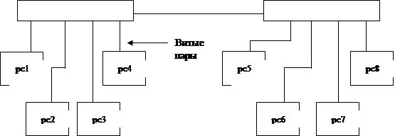 Рис.3. Структура сети Ethernet с двумя концентраторами Для соединения витых пар проводников с концентратором и сетевым адаптером используются стандартные телефонные разъемы RJ-45. По своей структуре и функциональным характеристикам адаптер станции совместим с адаптерами для коаксиального кабеля. В связи с этим в настоящее время с целью унификации выпускаются преимущественно универсальные сетевые адаптеры Ethernet 10BASE5/2/T, оснащенные разъемами DB-15, BNC и RJ-45. Дальнейшее повышение эффективности сетей Ethernet связывается с использованием коммутирующих концентраторов (switching hub), которые в отличие от обычных (ретранслирующих) концентраторов позволяют рассматривать сегменты сети в качестве отдельных сетей, связанных вместе через интерфейс коммутации пакетов. Коммутирующий концентратор снабжен двумя буферами на каждый подключаемый порт: для принимаемых и передаваемых пакетов. Благодаря этому коммутируемый концентратор работает аналогично узлу коммутации пакетов, принимая и передавая пакеты одновременно между различными парами абонентов. Это, наряду с увеличением производительности, позволяет избежать столкновений пакетов. Компьютерные сети, использующие подобную технологию, получили Switch Ethernet. Также новым технологическим направлением развития сетей Ethernet является оптоволоконная сеть Ethernet 10BASE-F со скоростью передачи 10 Мбит/с. В качестве передающей среды используется 50- или 100-микронный оптоволоконный кабель. Сеть характеризуется звездообразной топологией, которая поддерживается с помощью оптоволоконных концентраторов. Максимальная длина одного луча (сегмента) составляет 2100 метров. Подводя итог, следует отметить, что в настоящее время имеется широкий выбор сетевых адаптеров, повторителей и концентраторов, позволяющих создавать сети различного состава и конфигурации. В частности, практически все концентраторы, например IBM 8224, IBM 8271, имеют по несколько входов для подключения сегментов сетей 10BASE5, 10BASE2, 10BASE-T и 10BASE-F. FAST ETHERNETСеть Fast Ethernet представляет собой дальнейшее различие сети Ethernet за счет увеличения в 10 раз тактовой частоты. При этом основные аспекты построения сети Ethernet остались неизменными. В первую очередь это касается метода доступа, формата кадра и др. Основные отличия касаются физического уровня и связаны используемой передающей средой. В соответствии со стандартом IEEE 802.3u для технологии Fast Ethernet в зависимости от применяемого кабеля определены следующие три наименования: 100Base-TX и 100Base-T4 – для витой пары проводников и 100 Base-FX – для оптоволоконного кабеля. Система 100Base-FT использует две ары проводов: одну для передачи, другую – для приема данных. Спецификация стандарта на физическую среду передачи данных ANSI TP-PMD, на котором основано применение витой пары в 100Base-TX, допускает использование неэкранированной (UTP) категории 5 и экранированной (STP) витых пар. Наиболее распространенной средой является неэкранированная витая пара. В этом кабеле пары проводников должны быть завиты по всей длине, за исключением его концов, где кабель подключается к разъемам. Длина невитого участка не должна превышать 1-1,5 см. протяженность сегментов в сети 100Base-TX на кабеле UTP категории 5 с волновым сопротивлением 100 Ом не должна превышать 100 м. Это ограничение диктуется допустимым временем задержки распространения сигнала в передающей среде и является дост