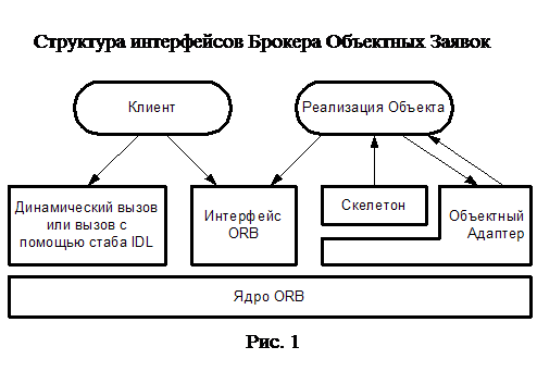 При формировании заявки клиент может использовать интерфейс динамического вызова или генерируемый компилятором IDL стаб (stub) - локальную процедуру вызова заданной операции при обращении к ней. Клиент может непосредственно взаимодействовать с ORB. В этом случае ORB ищет соответствующий код реализации объекта, пересылает ему параметры заявки и передает управление. Реализация объекта принимает параметры заявки через сгенерированный компилятором IDL скелетон (Skeleton) и при этом может обращаться к Объектному Адаптеру (Object Adaptor) и ORB [8]. Основная функция объектного адаптера, используемого для реализации CORBA-объекта, - обеспечение доступа к сервисам брокера объектных запросов. Объектный адаптер предоставляет все низкоуровневые средства для связи объекта с его клиентами. В число этих средств входят: 1) генерация ссылок на удаленные объекты, 2) вызов методов, определенных в IDL, 3) обеспечение безопасности взаимодействия, 4) активация и деактивация объектов, 5) установление соответствия между ссылками на удаленные объекты и реальными экземплярами объектов, 6) регистрация объектов. Спецификация OMG CORBA определяет базовый объектный адаптер, который должен быть реализован во всех брокерах запросов. Basic Object Adapter (BOA) - это набор интерфейсов для создания ссылок на удаленные объекты, регистрации объектов, авторизации запросов и активизации приложений. Базовый объектный адаптер является решением первоочередной задачи обеспечения связи между реализацией объекта и брокером запросов. Для организации взаимодействия между ORB и, например, системой управления базами данных должен быть разработан свой объектный адаптер [10]. Скелетон – серверная программа, которая связывает сервант с объектным адаптером, позволяя объектному адаптеру перенаправлять запросы к соответствующему серванту. При статических методах вызова скелетон формируется при компиляции IDL кода. При динамических – не используется[12]. В структуре ORB выделяется Ядро, обеспечивающее внутреннее представление объектов и передачу заявок, и набор надстраиваемых компонентов, интерфейсы которых маскируют различия в реализации ORB. Задачей Ядра является обеспечение мобильности программ и спецификаций типов, а также достижение интероперабельности компонентов в распределенной неоднородной среде. Клиенты максимально мобильны и должны работать без изменения исходного кода в среде любого ORB, который поддерживает отображение IDL в соответствующий язык программирования. Языковое отображение включает определение характерных для IDL типов данных и интерфейсов доступа к объектам средствами соответствующего языка программирования. Отображение определяет структуру интерфейса стаба клиента, интерфейса динамического вызова, скелетона реализации объекта, объектных адаптеров и прямые интерфейсы ORB. Для определенного языкового отображения обеспечивается программный интерфейс к стабу для каждого типа интерфейса. Стабы осуществляют обращения к ORB, используя скрытые и, возможно, оптимизированные для определенного ядра ORB интерфейсы. Для определенного языкового отображения и, возможно, в зависимости от используемого Объектного Адаптера будет обеспечиваться доступ к методам, реализующим каждый объектный тип. Вызов этих методов осуществляется через скелетон. Наличие скелетона не подразумевает сущес