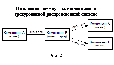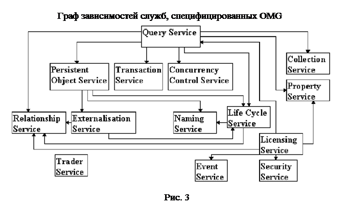 В трехуровневой архитектуре понятие клиента и сервера весьма условно. Компонент распределенной системы может выступать одновременно в роли клиента для другого компонента и быть сервером для других компонентов системы (рис. 2). 6. Стабы и скелетоны Клиентские стабы (заглушки) и серверные скелетоны выступают в роли «клея», который связывает языково-независимую спецификацию интерфейса на IDL с языково-зависимым кодом реализации. Клиентские стабы каждого интерфейса включаются клиентами, которые используют эти интерфейсы. Клиентский стаб для конкретного интерфейса обеспечивает пустые реализации для каждого метода этого интерфейса. Перед тем, как выполнить сервер функциональности, стаб клиента соединяется с Брокером Объектных Заявок, чтобы передать и получить параметры. Стаб клиента, который генерируется IDL-компилятором, это часть кода, которая делает доступным клиенту интерфейс конкретного CORBA сервера. Скелетон сервера, также генерируемый IDL-компилятором, это часть кода, которая обеспечивает «каркас», на котором построен код реализации сервера для конкретного интерфейса. 7. Основные объектные службы CORBA Трехуровневая архитектура информационных систем, согласно спецификациям OMG, включает в себя системы управления данными, сети взаимодействующих CORBA-объектов и пользовательские интерфейсы для представления данных. Однако очевидно, что в большинстве ИС требуется некоторое множество системных объектных сервисов, которые не зависят от предметной области и обеспечивают базовую функциональность для управления распределенными объектами. С целью облегчения создания распределенных приложений консорциум OMG стандартизовал наиболее часто употребляемые сервисы (спецификация CORBAservices 1.0) [10]. Сервис Жизненнго Цикла (Life Cycle Service) определяет операции создания, копирования, перемещения и удаления компонентов на шине [7]. Сервис Именования (Naming service) служит для управления и хранения ссылок на CORBA-объекты. Его основная задача состоит в том, чтобы универсальным образом организовать соединение объектов друг с другом. Служба имен представляет собой хранилище объектных ссылок. Обращение к этому сервису выполняется для получения нужной объектной ссылки, идентифицируемой по читаемому (понятному разработчику) имени объекта. Сервис Событий (Event service) обеспечивает поддержку асинхронного взаимодействия приложений. Сервис Долговременного Хранения (Persistence service) предоставляет набор универсальных интерфейсов для сохранения экземпляров объектов в долговременной памяти. Сервис разработан таким образом, что возможна его реализация на основе объектной базы данных. Сервис Транзакций (Transaction service) поддерживает множество моделей транзакций, включая вложенные транзакции. Сервис транзакций необходим для корректной работы приложений в многопользовательском режиме. Сервис Отношений (Relationship service) реализует логические связи между CORBA-объектами. Сервис определяет два дополнительных типа объектов: связь и роль. Роль представляет собой CORBA-объект, отражающий характер связи, а связь характеризует зависимости объектов прикладной области. Сервис Контроля Совместного Доступа (Concurrency control service) позволяет клиентам координировать свои действия при использовании разделяемых ресурсов. Управление разделяемыми ресурсами осуществляется с помощью блокировок. Каж
