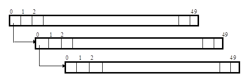 Список (массив) свободных блоков файлов состоит из пятидесяти элементов и занимает 100 байтов. В буфере, состоящем из пятидесяти элементов, записаны номера свободных блоков пространства блоков памяти. Эти номера записаны со второго элемента по сорок девятый. Первый элемент массива содержит номер последней записи в этом массиве. Нулевой элемент этого списка содержит ссылку на блок пространства блоков файлов, в котором этот список продолжен, и т.д. Если какому-то процессу требуется для расширения размера его файла дополнительный свободный блок, то система по указателю Номер Блока (НБ) выбирает элемент массива (копия суперблока всегда присутствует в оперативной памяти, поэтому почти при всех таких действиях система не нуждается в обращении к СВЗУ) и этот блок предоставляется соответствующему файлу для расширения (при этом корректируется указатель НБ). Если происходит сокращение размера файла или удаление всего файла, то высвободившиеся номера записываются в массив свободных блоков, при этом также происходит коррекция указателя НБ. Так как размер массива равен пятидесяти элементам, то возможны две критические ситуации. Первая - когда при освобождении новых блоков не удается поместить их номера в этом массиве, так как он уже полон. В этом случае из файловой системы выбирается один свободный блок (при этом он удаляется из списка свободных блоков) и заполненный массив свободных блоков копируется в этот блок. После этого значение указателя НБ обнуляется, а в нулевой элемент массива записывается номер блока, который мы выбрали для копирования в него нашего массива. В итоге, при постоянном освобождении блоков образуется список, в котором будут размещены номера абсолютно всех свободных блоков файловой системы. Вторая критическая ситуация - когда нужно получить свободный блок, но содержимое массива исчерпалось. В этом случае система действует так: если нулевой элемент списка равен нулю, то это означает, что исчерпалось все пространство файловой системы, и выдается сообщение об этом. Если он не равен нулю, то его содержимое равно адресу продолжения массива, и операционная система подчитывает соответствующий блок и размещает это продолжение на место массива в суперблоке. Второй массив, который находится в суперблоке - это