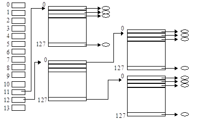 массива исчерпалось, то запускается процесс, который просматривает Лекция №8 Индексные дескрипторы. Индексные дескрипторы занимают несколько подряд идущих блоков на диске. Размер области индексных дескрипторов определяется параметром (который был определен при инсталляции системы), определяющим количество индексных дескрипторов для данной конкретной файловой системы. Размер области равен произведению этого количества на размер индексного дескриптора. Индексный дескриптор - это объект UNIX-а, который ставится во взаимно однозначное соответствие с содержимым файла, за исключением случаев, когда файл есть некий специальный файл, ассоциированный с внешним устройством. В индексном дескрипторе существуют следующие поля: 1. Поле, определяющее тип файла (каталог или нет). 2. Поле кода защиты. 3. Количество ссылок к данному индексному дескриптору из всевозможных каталогов файловой системы (в ситуации нарушения дерева файловой системы). Если значение этого поля равно нулю, то считается что этот индексный дескриптор свободен. 4. Длина файла в байтах. 5. Статистика: поля, характеризующие дату и время создания и т.п. 6. Поле адресации блоков файлов. Обратите внимание на то, что в индексном дескрипторе нет имени файла, хотя этот объект характеризует содержимое файла. Давайте посмотрим, как организована адресация блоков, в которых размещается содержимое файла. В поле адресации находятся номера первых десяти блоков файлов. Если файл небольшой, то вся информация о размещении его блоков находится в индексном дескрипторе. Если файл превышает десять блоков, то начинает работать некая списочная структура. Одиннадцатый элемент поля адресации содержит номер блока из пространства блоков файлов, в котором размещены 128 ссылок на блоки данного файла.