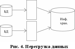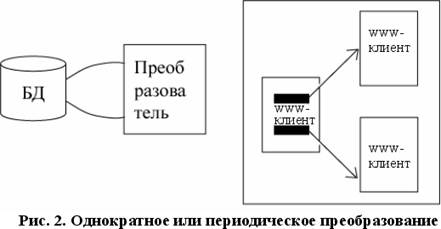 Это решение эффективно для больших баз данных со сложной структурой и при необходимости поддержки операций поиска. Показаниями также являются частое обновление и невозможность синхронизации преобразования БД в статические документы с обновлением содержимого. В этом варианте, возможно, осуществлять изменение БД из WWW-интерфейсов. К недостаткам этого метода можно отнести большое время обработки запросов, необходимость постоянного доступа к основной базе данных, дополнительную загрузку средств поддержки БД, связанную с обработкой запросов от WWW - сервера. Для реализации такой технологии необходимо использовать взаимодействие WWW-сервера с запускаемыми программами CGI - Common Gateway Interface. Выбор программных средств достаточно широк - языки программирования, интегрированные средства типа генераторов отчетов. Для СУБД с внутренними языками программирования существуют варианты использования этого языка для генерации документов. 1.1.3. Создание информационного хранилища на основе высокопроизводительной СУБД с языком запросов SQL. Периодическая загрузка данных в хранилище из основных СУБДВ этом варианте предлагается использование технологии, получившей название "информационного хранилища" (ИХ). Для обработки разнообразных запросов, в том числе и от WWW-сервера, используется промежуточная БД высокой производительности. Информационное наполнение промежуточной БД осуществляется специализированным программным обеспечением на основе содержимого основных баз данных. Этап 1 - перегрузка данных;