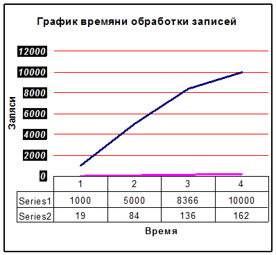 } } try { iniRecord = inifile.readLine(); } catch (IOException e) { done=true; } } } // извлечь значение public String getINIVar(String key, String defValue) { return INIProperties.getProperty(key, defValue); } // извлечь значение public String getINIVar(String key) { return INIProperties.getProperty(key); } public void init(ServletConfig conf) throws ServletException { super.init(conf); } public void service(HttpServletRequest req, HttpServletResponse res) throws ServletException, IOException { PrintStream out; out = new PrintStream(res.getOutputStream()); res.setContentType("text/html; charset=Cp866"); // Печать заголовка printPageHeader(out); INIFile("db.ini","c:\\www\\db",out); // Определяем кодировку String requestEnc = req.getCharacterEncoding(); String clientEnc = requestEnc; if ( requestEnc==null ) requestEnc=iso; requestEnc=iso; // Тело out.println("<body bgcolor=\"#FFFFFF\">"); out.println("<form method=\"get\" action=\"/serv/SearchEngein\">"); out.println(" <table width=\"461\" border=\"0\" cellpadding=\"0\" cellspacing=\"0\">"); out.println(" <tr bgcolor=\"#3399FF\"> "); out.println(" <td width=\"266\" class=\"text\"> Запрос</td>"); out.println(" <td width=\"135\" class=\"text\"> Каталог</td> "); out.println(" <td width=\"207\"> </td>"); out.println(" </tr>"); out.println(" <tr>"); out.println(" <td width=\"266\" valign=\"top\"> "); out.println(" <input type=\"text\" name=\"Query\" maxlength=\"100\" size=\"38\" value=\"\">"); out.println(" </td>"); out.println(" <td width=\"135\" valign=\"top\"> "); out.println(" <select name=\"select\" size=\"1\">"); out.println(" <option value=\"MARCFILE.Book\" selected>"+ConvertISO(getINIVar("KATALOG.Book"))+"</option>"); out.println(" <option value=\"MARCFILE.Stat\">"+ConvertISO(getINIVar("KATALOG.Stat"))+"</option>"); out.println(" <option value=\"MARCFILE.Periud\">"+ConvertISO(getINIVar("KATALOG.Periud"))+"</option>"); out.println(" <option value=\"MARCFILE.Podpis\">"+ConvertISO(getINIVar("KATALOG.Podpis"))+"</option>"); out.println(" <option value=\"MARCFILE.Ucheb\">"+ConvertISO(getINIVar("KATALOG.Ucheb"))+"</option>"); out.println(" </select>"); out.println(" </td>"); out.println(" <td width=\"207\" valign=\"top\"> "); out.println(" <input type=\"submit\" name=\"Start\" value=\"Поиск\">"); out.println(" </td>"); out.println(" </tr>"); out.println(" </table>"); out.println(" </form>"); // Конец тела // Взять текст из строки query = req.getParameter("Query"); if (query == null || query.length()<1) { printPageFooter(out); return; } dbselect = req.getParameter("select"); value = new String(ConvertISO(query)); // Чтение файла dbFileRead(getINIVar(dbselect), out, value); // Распечатка результата printPageFooter(out); query = null; value = null; } // Вывод заголовка документа private void printPageHeader(PrintStream out) { out.println("<html>"); out.println("<head>"); out.println("<meta http-equiv=\"Content-Type\" content=\"text/html; charset=Cp866\">"); out.println("<style type=\"text/css\">"); out.println("<!--"); out.println(".text { font: bold 12px Arial, Helvetica, sans-serif; color: #0000FF; text-decoration: none; text-align: left; }"); out.println(".bodytext { font: 12px Arial, Helvetica, sans-serif; color: #000000; text-decoration: none; text-align: left; }"); out.println("-->"); out.println("</style>"); out.println("</head>"); } private void printPageFooter(PrintStream out) { out.println("</body>"); out.println("</html>"); out.flush(); } } // Класс Запясь для хранения данных считаных из запяси class MarcRecord { protected String rAvtor; // Поле автор protected String rsAvtor; // Поле соавтор protected String rName; // Поле название произведения protected String rPrinter; // Поле издатель protected String rSize; // Поле Объем издания protected String rKey; // Поле ключевые слова protected String rSeria; protected String rBBK; protected String rKaIndex; MarcRecord( String r1, String r2, String r3, String r4, String r5, String r6, String r8, String r11, String r12) { rAvtor = r1; rsAvtor = r2; rName = r3; rPrinter = r4; rSize = r5; rKey = r6; rSeria = r8; rBBK = r11; rKaIndex = r12; } } Приложение 4 Результаты тестирования программы Тестирование программы проводилось на 4 массивах данных размером 1000, 5000, 8366, 10000 записей. Метод тестирования заключался в поиске последней записи массива по уникальному названию, чтобы определить время поиска по всему массиву. Полученные данные приведены в таблице и на основе данных построен график (см. график).