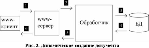 Этот вариант характеризуется минимальными начальными расходами. Он эффективен на небольших массивах данных простой структуры и редким обновлением, а также при пониженных требованиях к актуальности данных, предоставляемых через WWW. Кроме этого, очевидно полное отсутствие механизма поиска, хотя возможно развитое индексирование. В качестве преобразователя может выступать программный комплекс, автоматически или полуавтоматически генерирующий статические документы. Программа-преобразователь может являться самостоятельно разработанной программой либо быть интегрированным средством класса генераторов отчетов. 1.1.2. Динамическое создание гипертекстовых документов на основе содержимого БДВ этом варианте доступ к БД осуществляется специальной CGI-программой, запускаемой WWW-сервером в ответ на запрос WWW - клиента. Эта программа, обрабатывая запрос, просматривает содержимое БД и создает выходной HTML-документ, возвращаемый клиенту. (см. рис. 3)