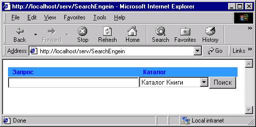 Рис. 6 Поисковая форма Программный код поисковой формы выглядит так: out.println("<form method=\"get\" action=\"/serv/SearchEngein\">"+ "<table width=\"461\" border=\"0\" cellpadding=\"0\" cellspacing=\"0\">"+ "<tr bgcolor=\"#3399FF\"> "+ "<td width=\"266\" class=\"text\"> Запрос</td>"+ "<td width=\"135\" class=\"text\"> Каталог</td> "+ "<td width=\"207\"> </td>"+ "</tr>"+ "<tr>"+ "<td width=\"266\" valign=\"top\"> "+ "<input type=\"text\" name=\"Query\" maxlength=\"100\" size=\"38\" value=\"\">"+ "</td>"+ "<td width=\"135\" valign=\"top\"> "+ "<select name=\"select\" size=\"1\">"+ "<option value=\"MARCFILE.Book\" selected>"+ConvertISO(getINIVar("KATALOG.Book"))+"</option>"+ "<option value=\"MARCFILE.Stat\">"+ConvertISO(getINIVar("KATALOG.Stat"))+"</option>"+ "<option value=\"MARCFILE.Periud\">"+ConvertISO(getINIVar("KATALOG.Periud"))+"</option>"+ "<option value=\"MARCFILE.Podpis\">"+ConvertISO(getINIVar("KATALOG.Podpis"))+"</option>"+ "<option value=\"MARCFILE.Ucheb\">"+ConvertISO(getINIVar("KATALOG.Ucheb"))+"</option>"+ "</select>"+ "</td>"+ "<td width=\"207\" valign=\"top\"> "+ "<input type=\"submit\" name=\"Start\" value=\"Поиск\">"+ "</td>"+ "</tr>"+ "</table>"+ "</form>"); Рассмотрим код более пристально. В тэге <form> присутствуют параметры metod и action. 1) метод (metod) говорит браузеру о том что данные(запрос) будет отправлены серверу; 2) действие (action) – в этом параметре находится путь к программе на старое сервера которая примет отправленный запрос для обработки. Следующий интересующий нас неотъемлемый компонент это тэг <input>, который тоже имеет несколько параметров type, name, value. Этот тэг является строкой ввода, рассмотрим его параметры. 1) тип (type) равный “text” говорит о том что это строка ввода; 2) имя (name) название запроса т.е. имя которое присваивается тексту введенному в строку ввода, в моей программе это Query; 3) значение (value) значение строки по умолчанию при начальной загрузке. Еще один значимый тэг формы <select> - это список для выбора базы в которой будет производится поиск. Данный тэг имеет свое имя которое указано в параметре name. Сам же список последовательно указан в тэге <option> относящимся к тэгу <select>. Каждая из строк начинающихся тэгом <option> является элементом списка для выбора. У тэга <option> есть параметр value в котором указан псевдоним выбранного пункта из списка – это нужно для определения какой пункт из списка выбран. И наконец последний значимый тэг <input>, в отличии от первого тэга <input> у этого тэга параметр тип(type) равен “submit” - это значит что это кнопка отправки запроса обработчику который указан в тэге <form>. У кнопки тоже есть имя (name) и значение (value) кнопка называется Start. Последним тэгом, всегда является закрывающий тэг </form>. После того как пользователь ввел запрос и нажал на кнопку “Поиск” в адресная строка браузера приобретет примерно вид : http://localhost/serv/SearchEngein?Query=%E1%A8%E1%E2%A5%AC%A0&select=MARCFILE.Stat&Start=%8F%AE%A8%E1%AA К ссылке на сервлет прибавилось три параметра отделенные от адреса сервлета вопросительным знаком первый параметр это Query (запрос), второй select говорящий сервлету в какой базе производить поиск. Первое что делает программа - это считывает файл настройки db.ini – который находится в папке c:\www\db. В данном файле находятся данные о место нахождении интересующей базы данных или говоря проще локальный путь к базе данных. Определив интересующую базу данных и установив ее место нахождения, программа начинает процесс поиска всех удовлетворяющих запросу данных (библиографических описаний). Программа считывает всю запись в массив, после чего начинается определение места нахождения полей и их длинны. Разберем код процедуры. public void dbFileRead(String dbNamePath, PrintStream out, String query) { Сперва производится инициализация всех переменных используемых при работе процедуры. Первый блок. Переменные для занесения значений полей String mAvtor = null; // 100 String msAvtor = null; // 700 String