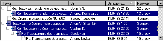 · После этого программа производит загрузку заголовков сообщений с сервера телеконференций. · Для того чтобы прочитать какое-либо сообщение щелкните по нему мышкой. Для чтения сообщений из телеконференции с подпиской на нее необходимо выполнить следующие действия: · Соединиться с сервером Урал Релком (если соединение еще не установлено). · Запустить программу Internet News. · Нажав на кнопку "Группы новостей", в появившемся окне (Рис. 6) выбрать нужную телеконференцию и нажать кнопку "Подписка". После этого нужно нажать на кнопку ОК. · Далее можно пометить интересующие Вас сообщения для загрузки, отметив их мышкой (с удержанием нажатой клавиши Ctrl) и выбрав пункт меню Автономная работа/Пометить сообщение для загрузки. Например, на Рис. 7 четыре сообщения выделены и помечены для загрузки. · Для того чтобы загрузить сообщения для последующего удаленного просмотра, необходимо выбрать в меню пункт "Автономная работа/Доставить".