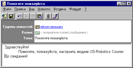 Подписка на конференцию гарантирует, что после отключения от Internet заголовки сообщений в конференции, а также те письма, которые были загружены останутся у Вас на жестком диске для дальнейшего просмотра. 6. Оправка сообщения в телеконференцию. Для того, чтобы послать сообщение в телеконференцию надо: · Соединиться с сервером Урал Релком (если соединение еще не установлено). · Запустить программу Internet News. · Нажав на кнопку "Группы новостей", в появившемся окне (Рис. 6) выбрать телеконференцию, в которую Вы хотите отправить сообщение, и нажать кнопку "Перейти". · Нажать на кнопку "Создать сообщение" (Рис. 5). При этом появится окно редактирования сообщения (Рис. 8). Имя конференции автоматически подставляется в поле "Группа новостей". В поле "Копия" вводятся адресаты (конкретные люди или названия телеконференций), которые получат копию Вашего письма. Ниже Вы пишете сам текст сообщения, которое Вы хотите послать в конференцию. Кроме того, в письме Вы можете посылать любые файлы: документы Word, Excel, картинки, видео или аудио записи и т.п. Для этого необходимо нажать на скрепочку (рис.4, верхняя панель инструментов) и выбрать нужное имя файла.