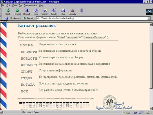 Итак, настройка: Перед нами графический интерфейс (рис. 1) программы Mail Box с открытым письмом. Для того, чтобы настроить программу для работы с вашей почтой, надо: вывести диалоговое окно настроек, в котором на вкладке Mail & Groups (которая предназначена для настройки почты). Меню (Рис. 2) Identity позволяет ввести информацию о пользователе: имя, на которое зарегистрирован почтовый ящик; адрес электронной почты; адрес (Email address) самой электронной почты, на которое приходят сообщения; далее следуют формы заполнение которых необязательно (имя организации и т.д.). Mail Server (Рис. 3) окно, которое в настройке электронной почты является самое главное, где указывается имя пользователя (mail server user name), которое требуется для входа в сервер (login); адрес исходящей почты (outgoing mail (SMTP) server), т.е. имя сервера, через который почта отсылается получателю; адрес входящей почты, т.е. имя сервера, через который почта приходит пользователю. Всё, почта настроена, теперь для того, чтобы доставить почту с сервера, надо нажимать на пиктограмму New Massages (при входе на сервер электронной почты надо ввести пароль, в некоторых почтовых программах пароль вводится в настройки почтовой программы, но в нашей почтовой программе это не используется в целях безопасности). Списки рассылки. Телеконференции. 1. Система списков почтовой рассылки. Как мы уже говорили в сети Internet существует множество сервисов (бесплатных и платных), которые предоставляются пользователю, но самый распространённый из них пожалуй является почтовые рассылки. Пользователь сам для себя выбирает: О чём бы он хотел каждый день узнавать всё новую и новую информацию. 2. Подписка на почтовую рассылку. Для того чтобы каждый день пользователю на электронный почтовый ящик приходили самые свежие новости, надо подписаться или зарегистрироваться на сервере почтовых рассылок (www.citycat.ru и т.д.), в процессе регистрации пользователь заполняет анкету в которой вводит информацию о себе, а также заполняет поля связанные с темами подписки, т.е. выбирает самые важные для себя темы. Например, список почтовой рассылки может выглядеть так (Рис. 4): 3.