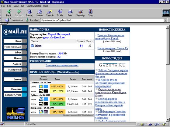 Знакомство с World Wide Web. 1. Структура WWW. Механизм функционирования WWW основывается на том, что все страницы Web описываются в виде текстовых файлов на специальном языке HTML (Hyper Text Markup Language – язык разметки гипертекстов). Команды этого языка могут указывать вид и расположение надписей, рисунков, указывать ссылки на другие ресурсы Web, соответствующие надписям-ссылкам и т.д. При обращении к Web-серверу он передаёт программе просмотра (Web-броузеру) описание страницы Web на языке HTML, а Web-броузер построит изображение этой страницы и показывает его пользователю. 2. Обзор программ для работы с WWW – броузеров. На данный момент существует множество программ для работы с WWW страницами, но самыми популярными и самыми являются Netscape Navigator и Internet Explorer. Так же появляются и многие другие броузеры, например Opera (самый маленький). 3. Работа с Netscape Navigator. На рисунке 9 показан графический интерфейс Web-броузера Netscape Navigator (версия 4.04) с открытой страничкой электронной почты (www.mail.ru).