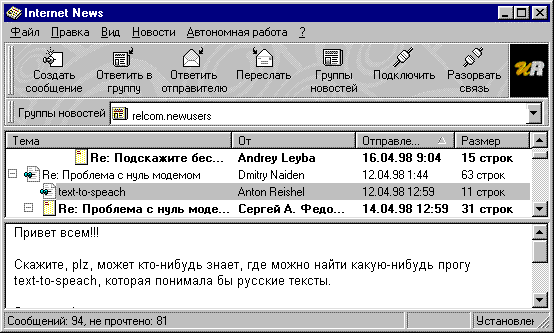Структура телеконференций. Организация системы телеконференций напоминает структуру обычных библиотек или архивов. В телеконференциях хранятся сообщения - статьи, полученные из разных источников, в том числе и от пользователей сети по электронной почте. Иерархия тематического каталога телеконференций непосредственно отражена в их названиях. Так например, название relcom.commerce.food.drinks Большой популярностью у нас, естественно, пользуются телеконференции на русском языке (иерархий relcom - более 150 тем, relis, demos и др.), распространяемые по всему миру. Примерно 30 процентов конференций посвящены коммерческой информации. Можно также подписаться на большинство телеконференций мировой системы USENET (несколько тысяч тем). С целью уменьшения общего трафика телеконференции "ретранслируются" рядом крупных узлов сети EUnet/Relcom. Специальным разделом коммерческих телеконференций является информационная система RELIS (RELcom Information System), материалы в которую поставляются информационными агенствами и организациями информационного бизнеса. 4. Работа с Internet News. Общие положения. На рис. 5 представлен внешний вид основного окна программы Internet News.