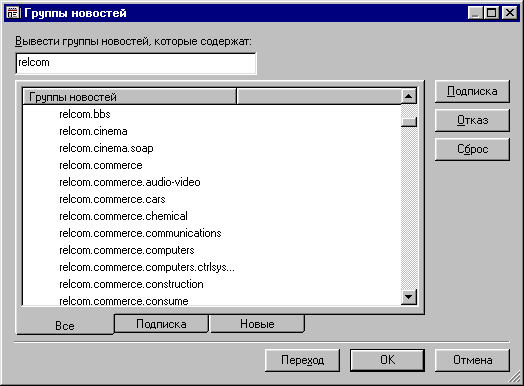Ниже (под выпадающим списком групп) показывается содержимое выбранной группы новостей. Для каждого сообщения выдается следующая информация: от кого пришло письмо, тема, и когда было получено письмо. Если слева от сообщения стоит знак «+», то это означает, что на это письмо имеется ответ. Нажав на «+» мышкой, Вы разворачиваете все обсуждение, т.е. будет видно и исходное сообщение и все ответы на него. Свернуть обсуждение можно щелкнув мышкой по знаку - слева от сообщения. Еще ниже показан текст сообщения, на котором стоит курсор. 5. Чтение сообщений из телеконференции. Существует два способа чтения телеконференций: с подпиской или без нее. Для чтения сообщений из телеконференции без подписки на нее необходимо выполнить следующие действия (на примере соединения с Урал Релком): · Соединиться с сервером Урал Релком (если соединение еще не установлено). · Запустить программу Internet News. · Нажав на кнопку "Группы новостей" в появившемся окне (Рис. 6) выбрать нужную группу новостей и нажать кнопку "Переход". Для того чтобы не выводить длинный список групп новостей, в верхнем поле ввода можно набрать ключевое слово. После этого в окне останутся только те группы новостей, которые содержат данную последовательность символов в своем названии.