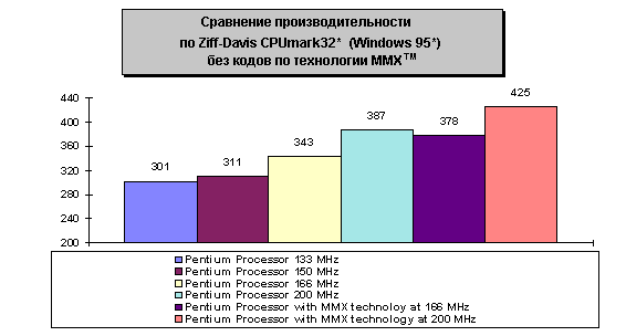 Таблица 5: Индексы производительности iCOMP Index 2.0 Тесты производительности при выполнении целочисленных операций эмулируют работу пользователей с повседневными типовыми приложениями типа текстовых процессоров, электронных таблиц, финансовых, презентационных программ и др. Традиционные наборы тестовых программ не были разработаны для измерения производительности систем при работе с современными приложениями, богатыми графикой, звуком и видео. Наборы тестовых мультимедиа-программ были специально разработаны для эмуляции работы стандартного пользователя с такими средствами, как видео MPEG1 и MPEG2, цифровой звук Dolby, файлы в формате AVI, обработка изображений или видеоконференции, а также с аналогичными приложениями, насыщенными различными данными. Приложения, применяющие технику трехмерной визуализации, такие как игры, все чаще используют улучшенную производительность операций с плавающей точкой, чтобы поддерживать насыщенные текстуры и расширенные эффекеты освещения. Производительность операций с плавающей точкой - критический фактор для прикладных программ автоматизированного рабочего места типа CAD (CAD - Computer Aided Design). Рассмотрим подробно тесты, составляющие iCOMP INDEX 2.0. Производительность процессора Pentium при выполнении действий с целыми 32-разрядными числами в среде Windows иллюстрируется с помощью обычно используемых эталонных тестов Windows. Эти эталонные тесты демонстрируют высокие потенциальные возможности процессора Pentium корпорации Intel, когда на нем выполняются 32-разрядные приложения. CPUmark32* представляет собой работающий в среде Windows 32-разрядный эталонный тест, созданный в Ziff-Davis Labs. Этот тест был разработан для измерения потенциальной производительности при выполнении будущих 32-разрядных приложений. Norton SI32* является 32-разрядным тестом, работающим под Windows 95. Он предназначен для сравнения производительностей систем однотипной конфигурации (центральный процессор, кэш второго уровня и оперативная память) при выполнении 32-разрядных приложений. Этот эталонный тест является составной частью модуля SYSINFO*, входящего в состав Norton Utilities* for Windows 95. На рис.1 и 2 показана производительность процессоров Pentium корпорации Intel, при выполнении этих двух популярных 32-разрядных тестов.