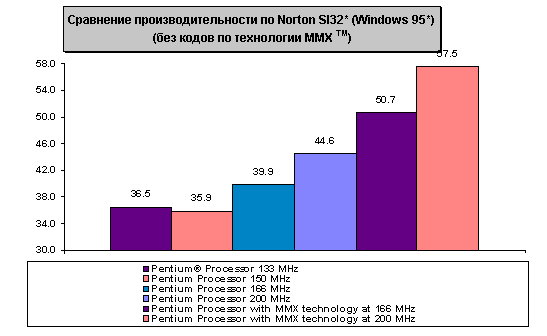Рисунок 2: Norton SI32 Эталонный тест SPEC CPU95* является программным продуктом, разработанным корпорацией Standard Performance Evaluation Corp. (SPEC) — некоммерческим объединением, в которое вошли производители компьютеров, системные интеграторы, университеты, издатели, исследовательские организации и консультанты со всего мира. Этот эталонный тест был разработан для проведения измерений производительности, чтобы можно было сравнивать скорость работы различных компьютерных систем при интенсивных вычислениях. SPEC95 состоит из двух комплектов эталонных тестов: CINT95* для измерения и сравнения производительности при интенсивных целочисленных вычислениях и CFP95* для измерения и сравнения производительности при интенсивных вычислениях с плавающей точкой. Эти два комплекта позволяют проводить на компонентном уровне эталонны тесты, измеряющие производительность центрального процессора, архитектуры памяти и компилятора. Эталонные тесты SPEC выбираются из существующих прикладных программ и исходные коды эталонных тестов могут работать на самых разных компьютерных платформах. Каждый эталонный тест проверяется на разных платформах, что позволяет получить объективные результаты оценки производительности для конкурирующих программных и аппаратных систем. Комплект CINT95, написанный на языке С, содержит восемь целочисленных эталонных тестов, требующих интенсивных процессорных вычислений. Он используется для измерения и подсчета следующих метрик: · SPECint95 — вычисление среднего геометрического восьми нормированных значений (по одному на каждый целочисленный эталонный тест), когда для каждого эталонный теста была проведена компиляция с глубокой оптимизацией. · SPECint_base95* — вычисление среднего геометрического восьми нормированных значений, когда для каждого эталонный теста была проведена компиляция с обычной оптимизацией. Комплект CFP95, написанный на языке Фортран*, содержит десять эталонных тестов, требующих интенсивных процессорных вычислений с плавающей точкой. Он используется для измерения и подсчета следующих метрик: · SPECfp95 — вычисление среднего геометрического десяти нормированных значений (по одному на каждый эталонный тест с плавающей точкой), когда для каждого эталонный теста была проведена компиляция с глубокой оптимизацией. · SPECfp_base95* — вычисление среднего геометрического десяти нормированных значений, когда для каждого эталонный теста была проведена компиляция с обычной оптимизацией. Так как подавляющее количество современных коммерческих приложений создано на основе программ, использующих интенсивные целочисленные вычисления, то смесь инструкций, используемая SPECint95, в наибольшей степени подходит для коммерческих приложений и, таким образом, является существенно более эффективным эталонным тестом, чем SPECfp95, для предсказания производительности процессора при работе с 32-разрядными приложениями для сферы бизнеса. На SPECint95 производительность разработанного Intel процессора Pentium с технологией MMX и тактовой частотой 200 МГц оказалась на 26 % выше, чем производительность такого же процессора, но без технологии MMX. Данные о производительности приведены на нижеследующих рисунках. Рисунки 3 и 4 показывают производительности процессоров на тестах SPECint95 и SPECfp95, когда в конфигурациях присутствует кэш второго уровня («кэш L2») объемом 512 Кб.