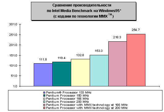 Рисунок 5: Intel Media Benchmark Приведу в пример конфигурацию системы, на которой тестировались процессоры для определения индекса iCOMP Index 2.0. Следует отметить, что конфигурация систем для тестов SPEC95 и Intel Media Benchmark немного отличались от приведенной ниже.