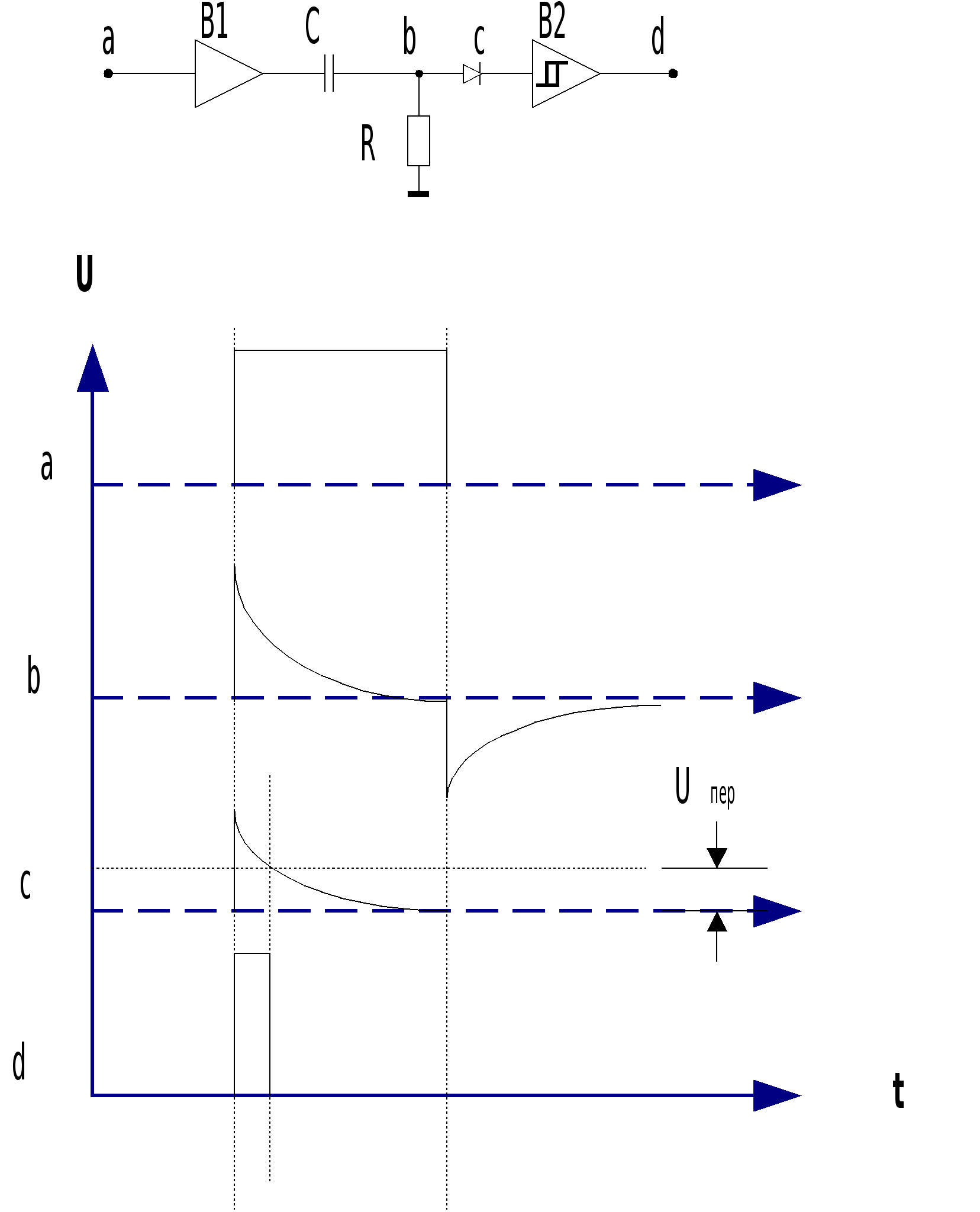 Для формирования короткого импульса по положительному перепаду (фронту) применяется дифференцирующее RC-звено. Через выход буферного усилителя B1 и резистор R заряжается конденсатор С. В начале заряда потенциал в точке b скачком возрастает и по мере заряда снижается до нуля по експотенциальному закону. На выходе порогового элемента B2 появляется высокий уровень. Снижение потенциала в точке c до Uпер вызывает переключение B2 в низкий уровень (точка d). По окончании импульса на входе схемы конденсатор C разряжается через выход буферного усилителя B1 и резистор R , диод на входе B2 не пропускает отрицательный импульс (точка с). Длительность ввыходного импульса можно изменять значениями С и/или R т.к. постоянная времени дифференцирующей RC-цепи равна произведению R на С. Конденсатор заряжается до 99% Uвх за t= 5RC. ЗАДАЧА № 3. Пpедложите формирователь коротких импульсов по переднему фронту положительного прямоугольного импульсного сигнала на основе интегрирующих RC-цепей, диодов и логических элементов. Уровни входных и выходных сигналов должны соответствовать уровням ТТЛ - логики. В ответе пpивести: структурную и функциональную (или принципиальную) схемы; временную диаграмму, которая показывает формы сигналов в основных характерных точках схемы; кpаткое описание принципа действия; объяснение – за счет чего и как можно изменять длительность формируемого импульса. Формирователь коротких импульсов по фронту входного импульса на основе интегрирующего RC-звена.