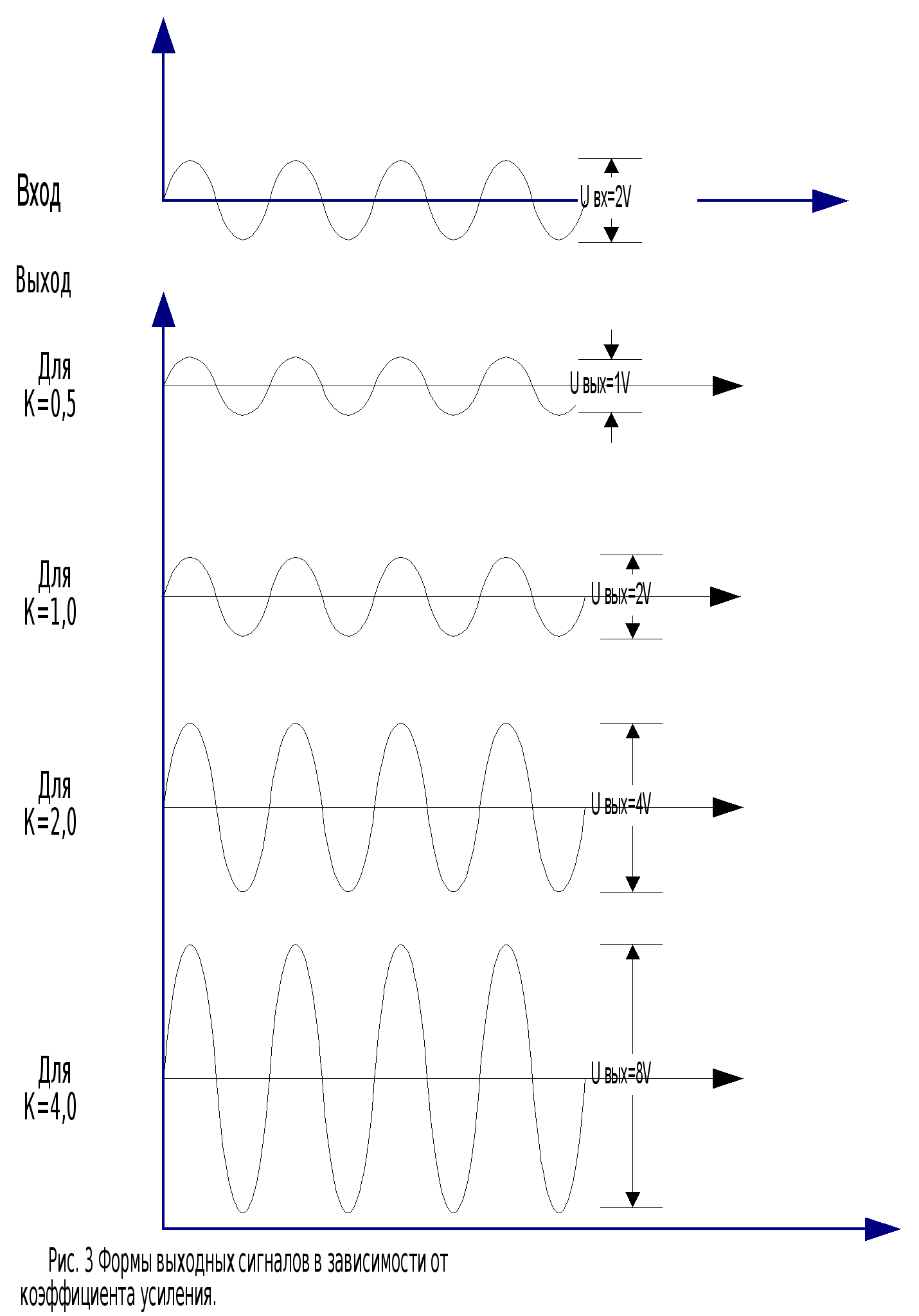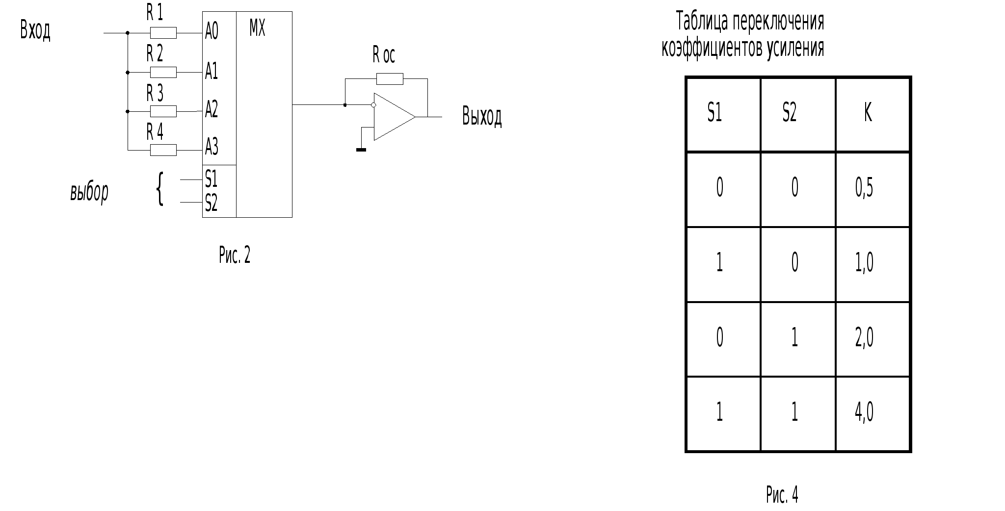 Положительный перепад в точке a через буферный элемент B1 и резистор R заряжает конденсатор C (точка b). За время t напряжение на входе порогового элемента B2 (точка c) достигает значения необходимого для переключения B2, на выходе которого появляется высокий уровень (точка d). С входа (точка a) высокий уровень подаётся также на вход 2 логического элемента DD1(исключающее ИЛИ), на выходе которого появляется высокий уровень, т.к. на входе 1 в течение времени t присутствует низкий. По прошествии времени tDD1 переключается в “0”. Два высоких уровня на входах DD2 переключают выход этого элемента (логическое И) в высокий уровень (точка f). Длительность выходного импульса можно регулировать, изменяя значения R и/или C. ЗАДАЧА № 5. Пpедложите нормиpованный усилитель (НУ) с программно - перестpаиваемым коэффициентом пеpедачи. В ответе приведите: функциональную схему НУ на основе идеального операционного усилителя (ОУ); краткое описание принципа действия; расчеты элементов схемы (резисторов) для следующих коэффициентов передач: К1=0,5, К2=1, К3=2, К4=4 и минимального значения резистора обpатной связи Roc=100 кОм; форму входных и выходных сигналов для заданных Кi (i=1,2,3,4) при условии, что на вход НУ подаются синусоидальные сигналы с амплитудой 2 V, а напряжение питания ОУ – 6 V. Нормирующий усилитель с программно переключаемым коэффициентом усиления на основе операционного усилителя и аналоговых ключах на полевых транзисторах.