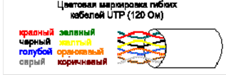 Каждая пара проводников в кабеле помечена своим цветом - один из проводников имеет сплошную окраску, для другого чередуется белая и цветная окраска. Пары маркируются голубым, оранжевым, зеленым и коричневым цветами. На внешней оболочке кабеля должна быть указана категория. Розетки и разъемы UTP