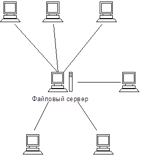 Разветвитель служит центральным узлом в сетях с топологией «звезда». РепитерПри передаче по сетевому кабелю электрический сигнал постепенно ослабевает (затухает). И, искажается до такой степени, что компьютер перестает его воспринимать. Для предотвращения искажения сигнала применяется репитер, который усиливает (восстанавливает) ослабленный сигнал и передает его дальше по кабелю. Применяются репитеры в сетях с топологией «шина». Существует ряд принципов построения ЛВС на основе выше рассмотренных компонентов. Такие принципы еще называют - топологиями. Топологии вычислительной сети.Топология типа звезда.Концепция топологии сети в виде звезды пришла из области больших ЭВМ, в которой головная машина получает и обрабатывает все данные с периферийных устройств как активный узел обработки данных. Этот принцип применяется в системах передачи данных, например, в электронной почте RELCOM. Вся информация между двумя периферийными рабочими местами проходит через центральный узел вычислительной сети. Топология в виде звезды Пропускная способность сети определяется вычислительной мощностью узла и гарантируется для каждой рабочей станции. Коллизий (столкновений) данных не возникает. Кабельное соединение довольно простое, так как каждая рабочая станция связана с узлом. Затраты на прокладку кабелей высокие, особенно когда центральный узел географически расположен не в центре топологии. При расширении вычислительных сетей не могут быть использованы ранее выполненные кабельные связи: к новому рабочему месту необходимо прокладывать отдельный кабель из центра сети. Топология в виде звезды является наиболее быстродействующей из всех топологий вычислительных сетей, поскольку передача данных между рабочими станциями проходит через центральный узел (при его хорошей производительности) по отдельным линиям, используемым только этими рабочими станциями. Частота запросов передачи информации от одной станции к другой невысокая по сравнению с достигаемой в других топологиях. Производительность вычислительной сети в первую очередь зависит от мощности центрального файлового сервера. Он может быть узким местом вычислительной сети. В случае выхода из строя центрального узла нарушается работа всей сети. Центральный узел управления - файловый сервер мотает реализовать оптимальный механизм защиты против несанкционированного доступа к информации. Вся вычислительная сеть может управляться из ее центра.