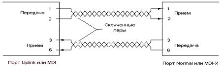 При обмене данными между двумя устройствами приемник одного из устройств должен быть соединен с передатчиком другого и наоборот. Перекрутка пар (cross-over) обычно реализуется внутри одного из устройств при разводке кабеля в разъеме. Некоторые порты концентраторов и коммутаторов поддерживают возможность смены типа разводки проводников в разъеме (MDI-X или Normal). Сетевые адаптеры компьютеров обычно не позволяют менять тип разводки порта и обозначаются как устройства с портом MDI или Uplink.