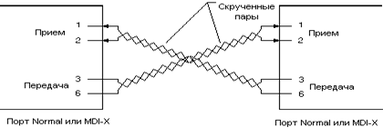 Рисунок 1. Соединение прямым кабелем Рисунок 2. Соединение перекрученным кабелем