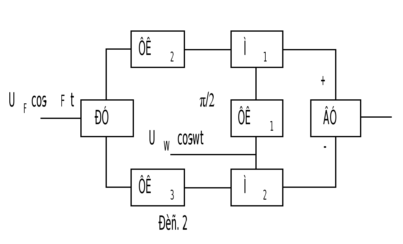 Схема содержит: РУ – развязывающие устройства; ВУ – вычитающие устройства; ФК – фазовые контура; М – модуляторы. На схеме (рис. 2) фазовый сдвиг π/2 для несущей частоты создает фазовый контур ФК1. Фазовые контуры ФК2 и ФК3 создают фазовый сдвиг π/2 для всех частот исходного сигнала в одном плече по отношению к другому.